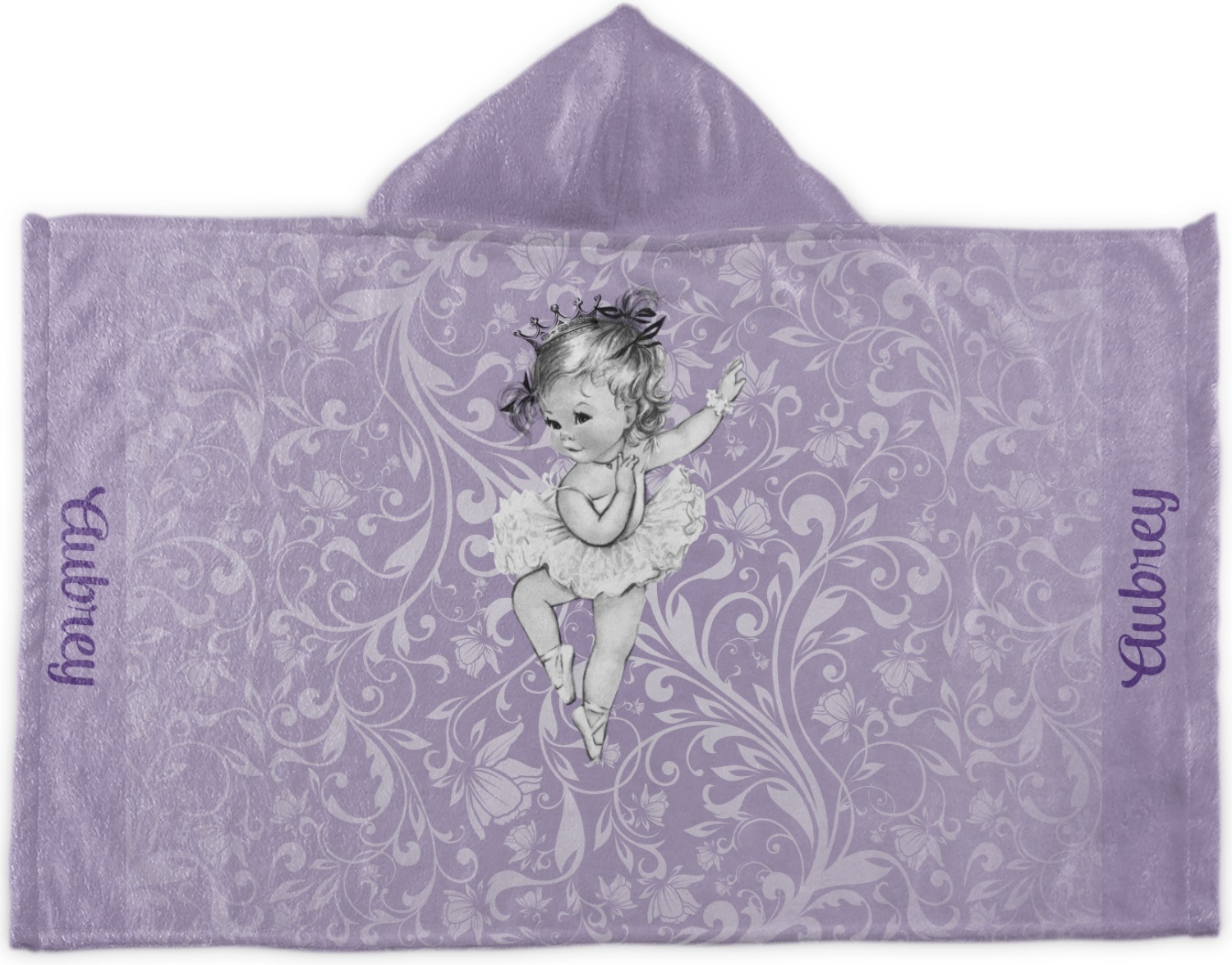 Our ballerina design is simply stunning and is perfect for the baby or little girl that is going to grow up to be a ballerina. We have create yet another layered design. The background is a beautiful, elegant floral pattern that we have done purple/lavender tone on tone color. Our second background is a subtle radial fill to highlight our beautiful ballerina. In the foreground, we have our beautiful vintage ballerina. For personalization, we added her name in a simple upright script font.