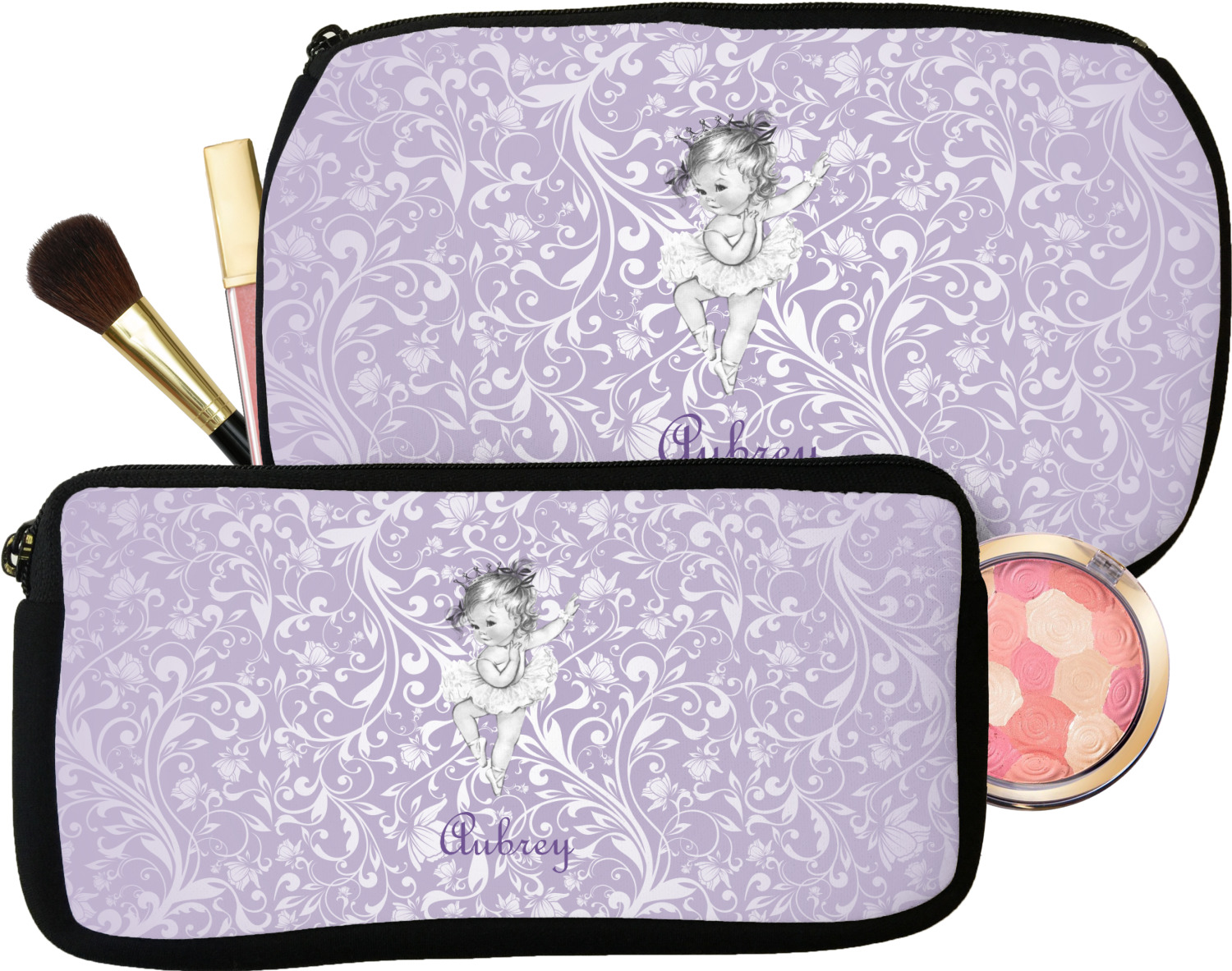 Our personalized makeup bags are available in many different designs, patterns and colors - so you are sure to find one that will love. They are made of neoprene (same material as wet-suits) and thus are water resistant, so spillages in your makeup bag will not end up all over you purse. They are customized on one side and are black on the other side and the zipper is black as well.