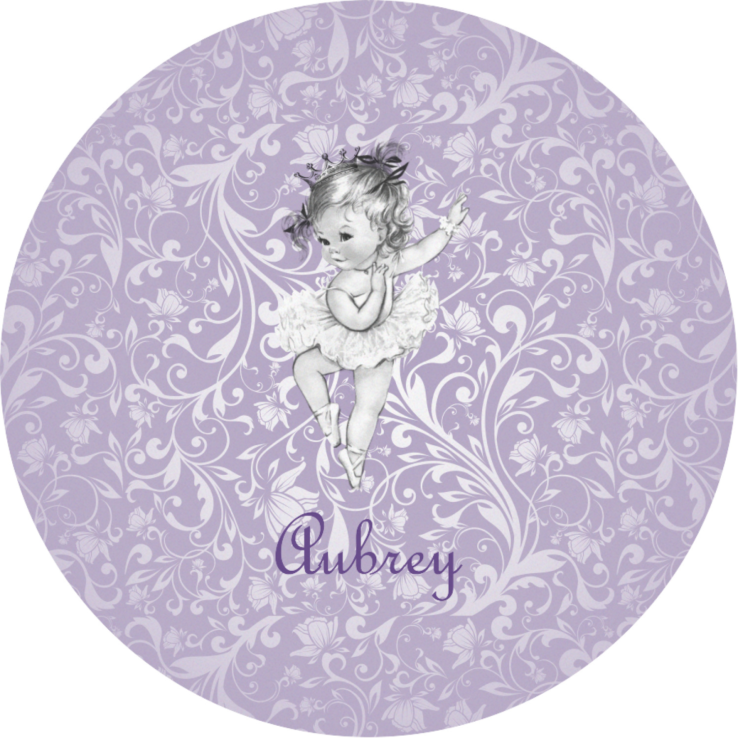 Our ballerina design is simply stunning and is perfect for the baby or little girl that is going to grow up to be a ballerina. We have create yet another layered design. The background is a beautiful, elegant floral pattern that we have done purple/lavender tone on tone color. Our second background is a subtle radial fill to highlight our beautiful ballerina. In the foreground, we have our beautiful vintage ballerina. For personalization, we added her name in a simple upright script font.