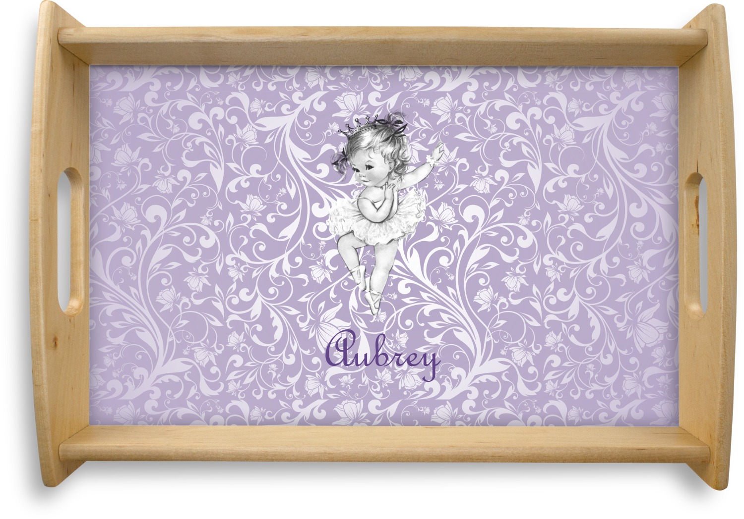 This serving tray with handles features square edges and two rounded sides, creating a very modern look. Each side is fabricated from a beautifully cut, natural wood. The bottom of the interior of the tray displays your customized design in bright, vibrant color. The tray is sold in both a black color and a natural wood look. Each variation of the wood serving tray has two sizes: Small, which is 14" x 10" x 2.25", and Large, which is 19.5" x 13.5" x 2.75".