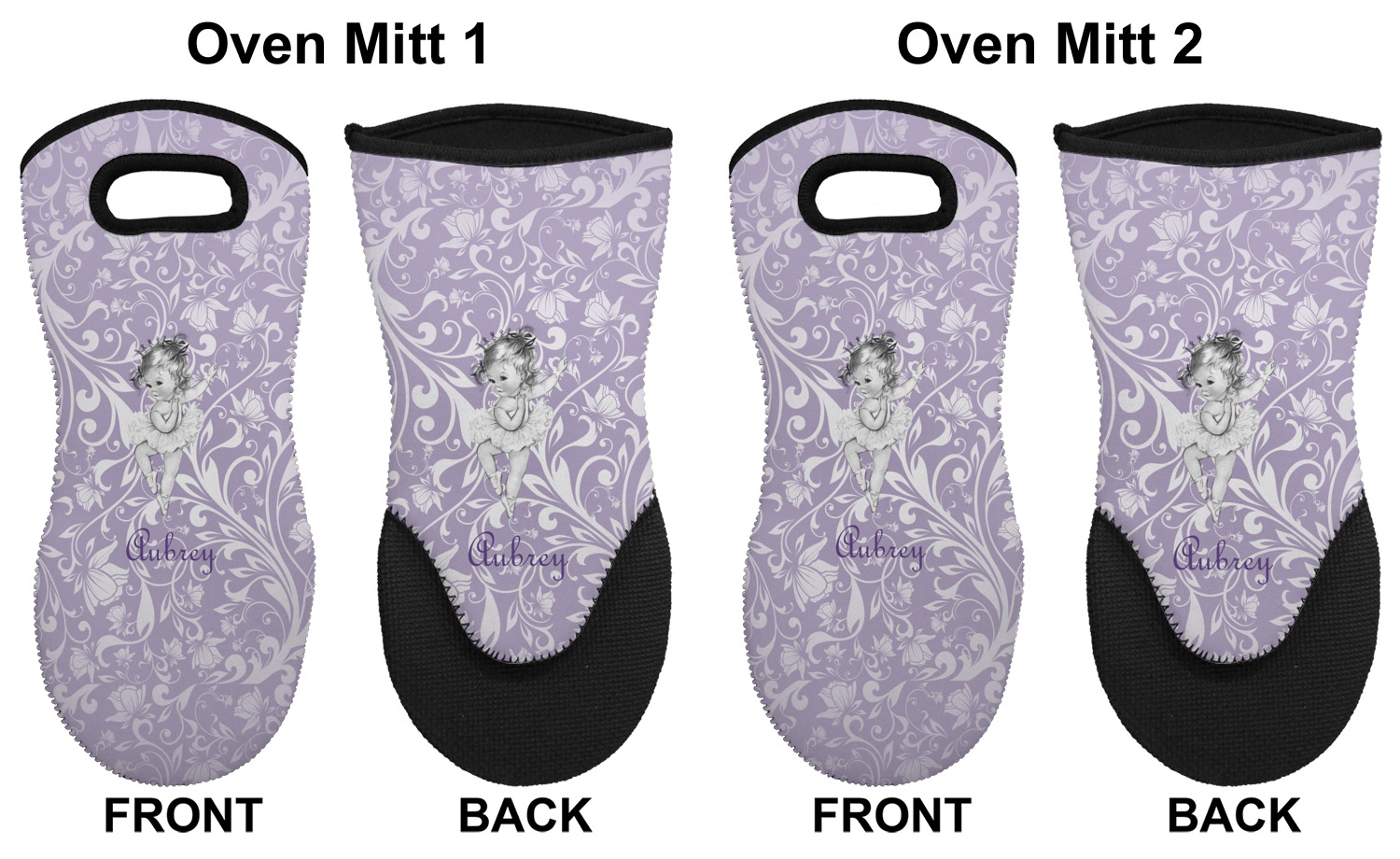 These heat resistant gloves are made entirely of a durable neoprene; the front features a softer texture, while the palm's side has a textured surface, meant to handle heat up to 500 degrees Fahrenheit. Thick, heavy duty stitching connects the two sides. A small, oval cutout appears on the front, and can be used to hang and store the mitt. Your personalization appears on the front, and the upper part of the back of the mitt. The style of these oven mitts are suitable for both the right and left hand, depending on your needs. If you need one for each hand, be sure to order two!