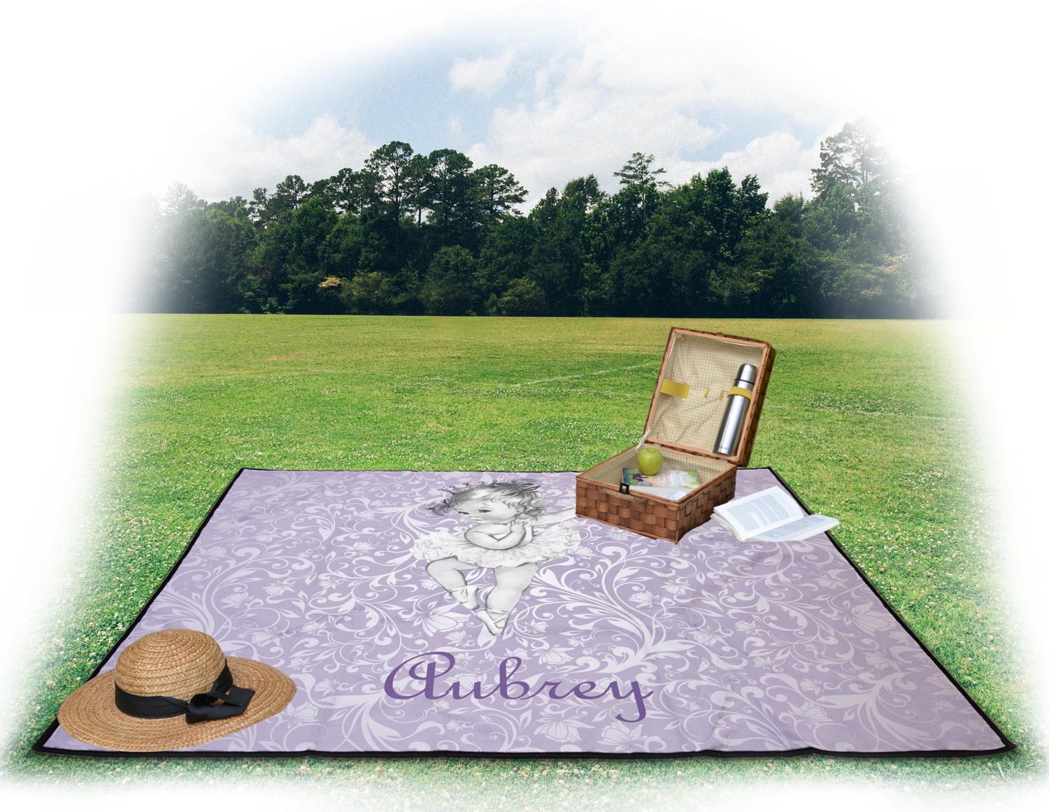 This picnic blanket is perfect for hanging out with your friends at the park or anywhere outside. The top of the blanket is made of a super soft microfiber fleece. The bottom of the blanket is made of a black material similar to a rain jacket and is water repellent as well. This will keep any wet spots on the ground from soaking through your picnic blanket. No one likes a wet blanket. The blanket measures at approximately 50" x 59" and has a nicely finished ribbon edge.