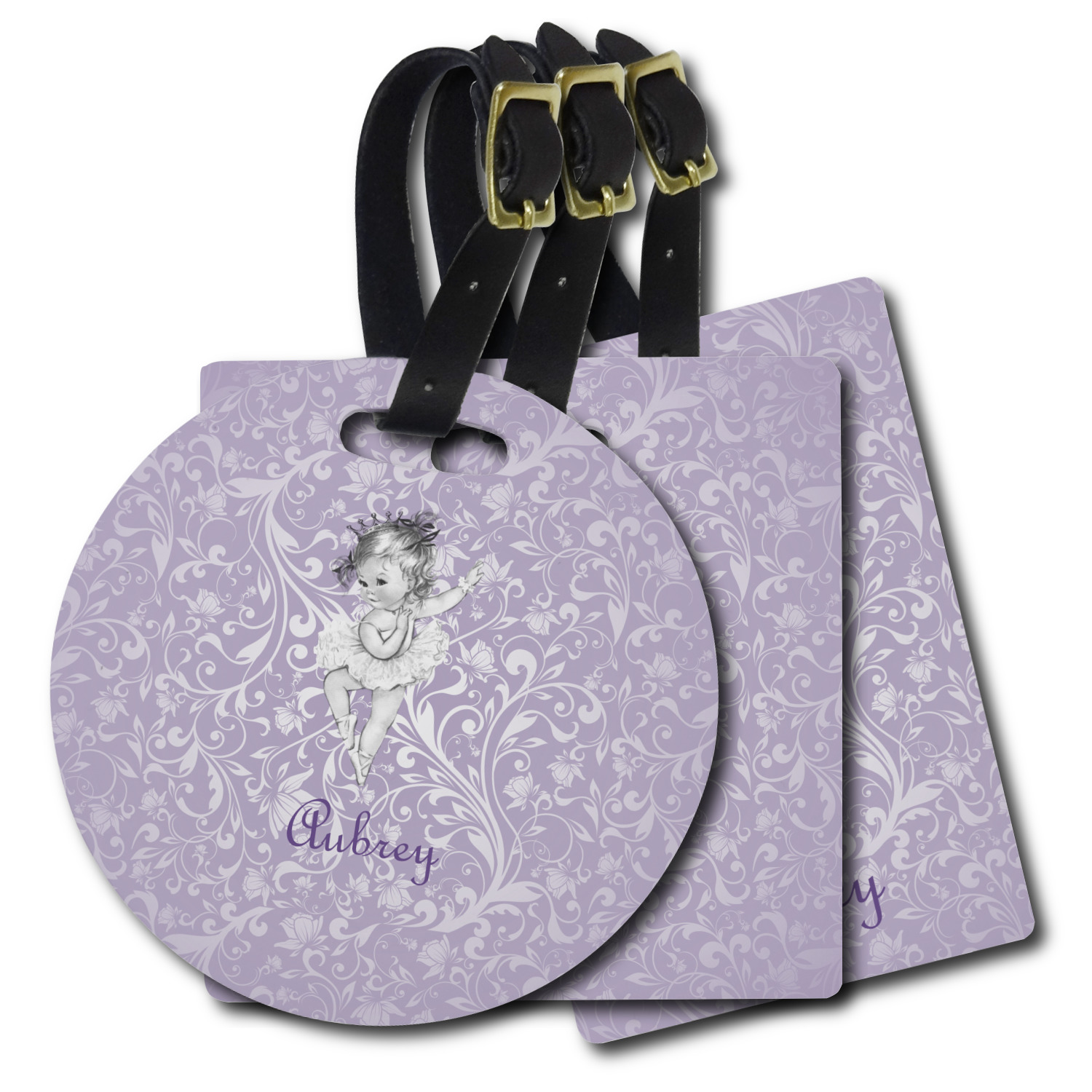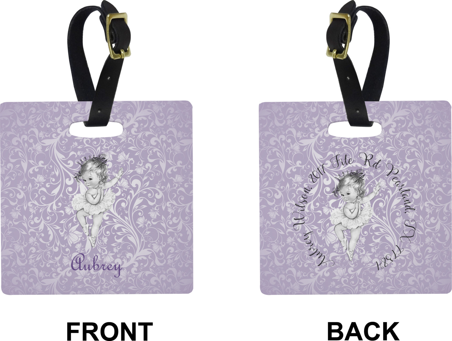 These personalized bag tags are sold in a variety of shapes, so that you may find the product that meets your vision exactly. We sell a round luggage tag, which measures at approximately 4" x 4". Our square luggage tag is about 3.5" x 3.5", while our rectangular version is 2.75" x 4 ".