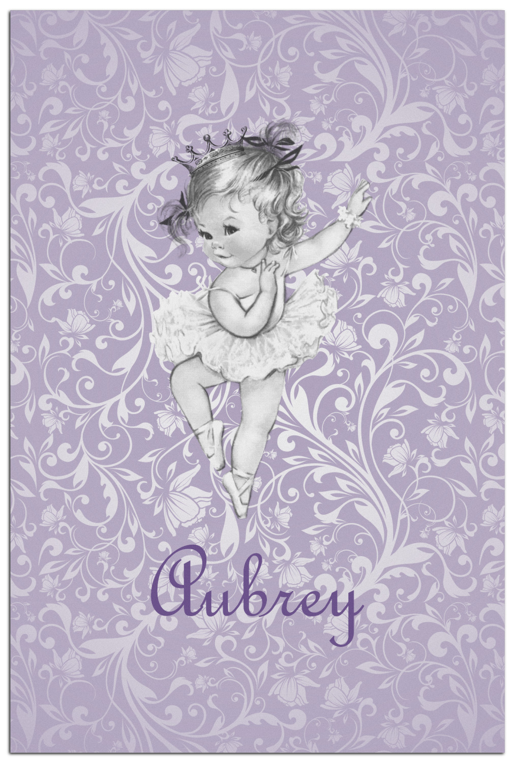 Our ballerina design is simply stunning and is perfect for the baby or little girl that is going to grow up to be a ballerina. We have create yet another layered design. The background is a beautiful, elegant floral pattern that we have done purple/lavender tone on tone color. Our second background is a subtle radial fill to highlight our beautiful ballerina. In the foreground, we have our beautiful vintage ballerina. For personalization, we added her name in a simple upright script font.