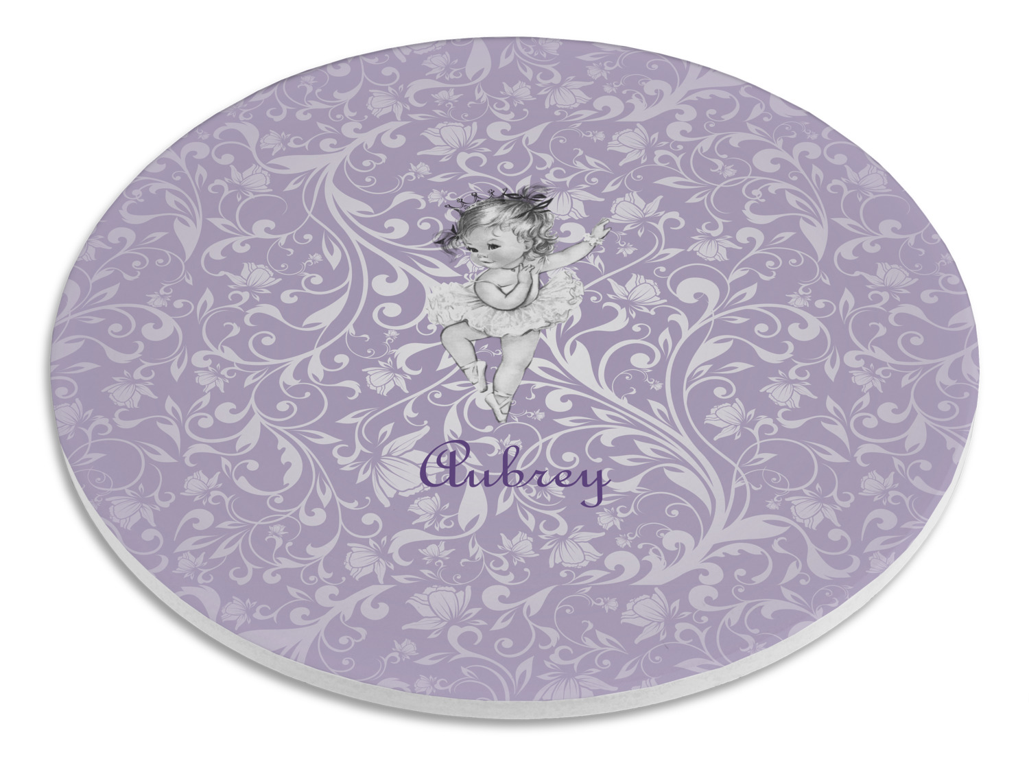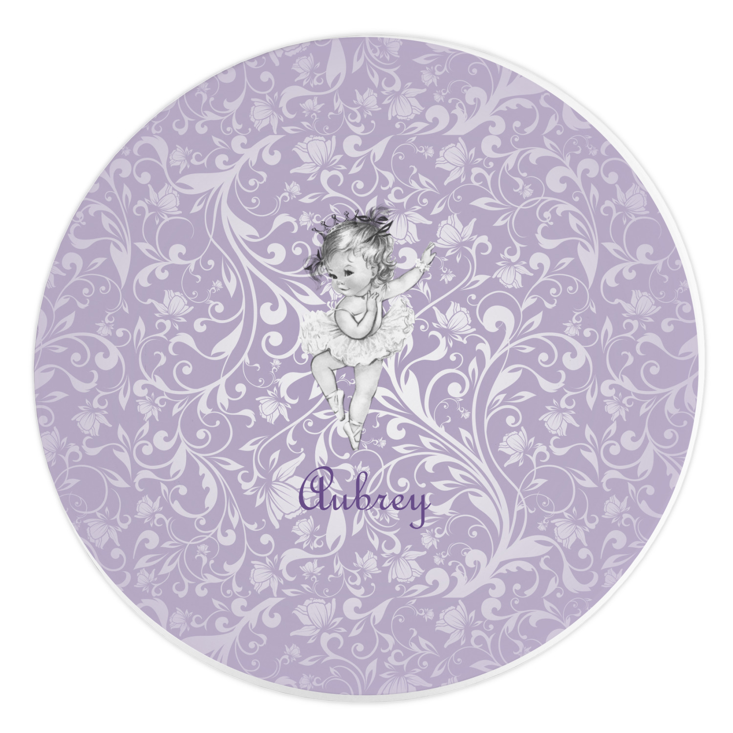 Our ballerina design is simply stunning and is perfect for the baby or little girl that is going to grow up to be a ballerina. We have create yet another layered design. The background is a beautiful, elegant floral pattern that we have done purple/lavender tone on tone color. Our second background is a subtle radial fill to highlight our beautiful ballerina. In the foreground, we have our beautiful vintage ballerina. For personalization, we added her name in a simple upright script font.