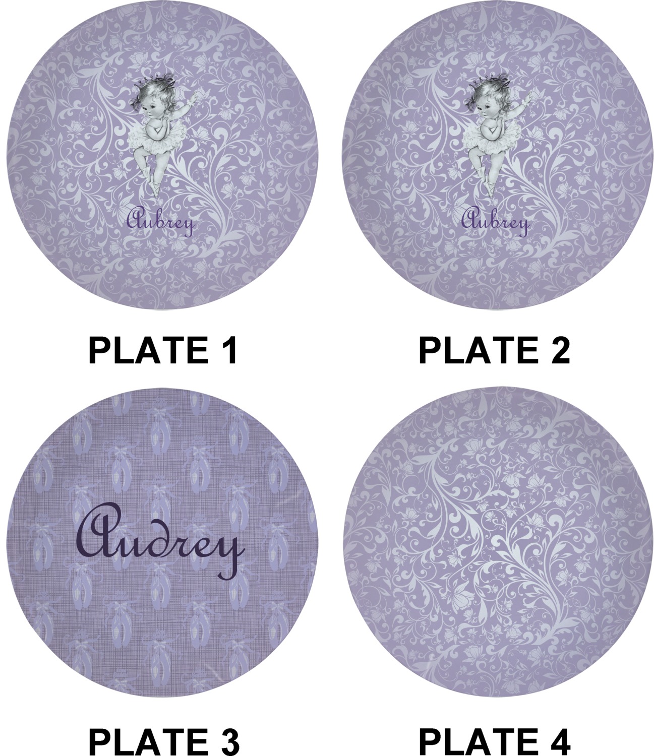 Our ballerina design is simply stunning and is perfect for the baby or little girl that is going to grow up to be a ballerina. We have create yet another layered design. The background is a beautiful, elegant floral pattern that we have done purple/lavender tone on tone color. Our second background is a subtle radial fill to highlight our beautiful ballerina. In the foreground, we have our beautiful vintage ballerina. For personalization, we added her name in a simple upright script font.