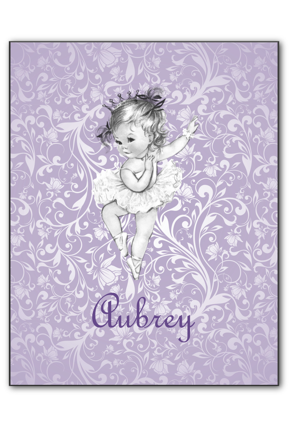 Our ballerina design is simply stunning and is perfect for the baby or little girl that is going to grow up to be a ballerina. We have create yet another layered design. The background is a beautiful, elegant floral pattern that we have done purple/lavender tone on tone color. Our second background is a subtle radial fill to highlight our beautiful ballerina. In the foreground, we have our beautiful vintage ballerina. For personalization, we added her name in a simple upright script font.