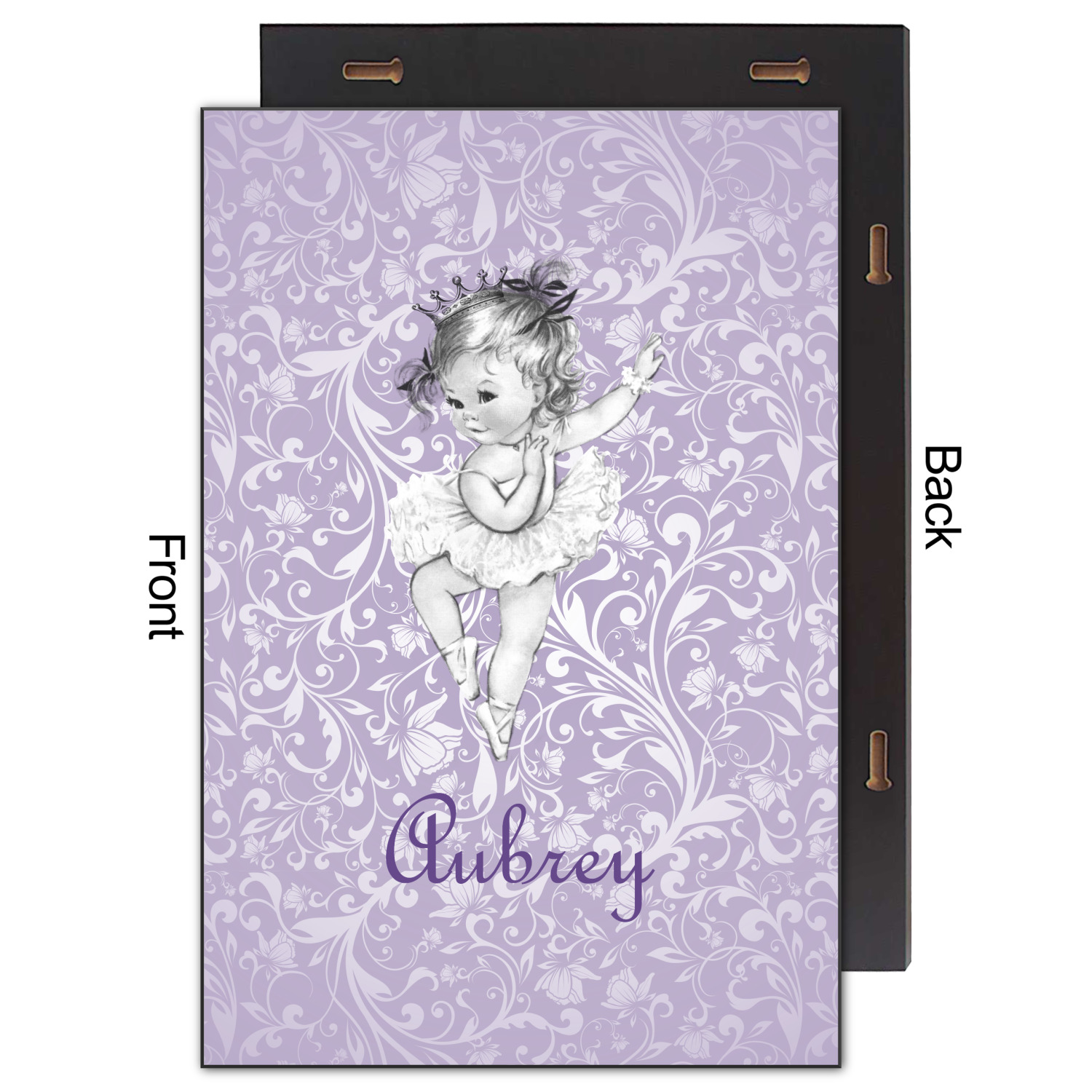 Our ballerina design is simply stunning and is perfect for the baby or little girl that is going to grow up to be a ballerina. We have create yet another layered design. The background is a beautiful, elegant floral pattern that we have done purple/lavender tone on tone color. Our second background is a subtle radial fill to highlight our beautiful ballerina. In the foreground, we have our beautiful vintage ballerina. For personalization, we added her name in a simple upright script font.