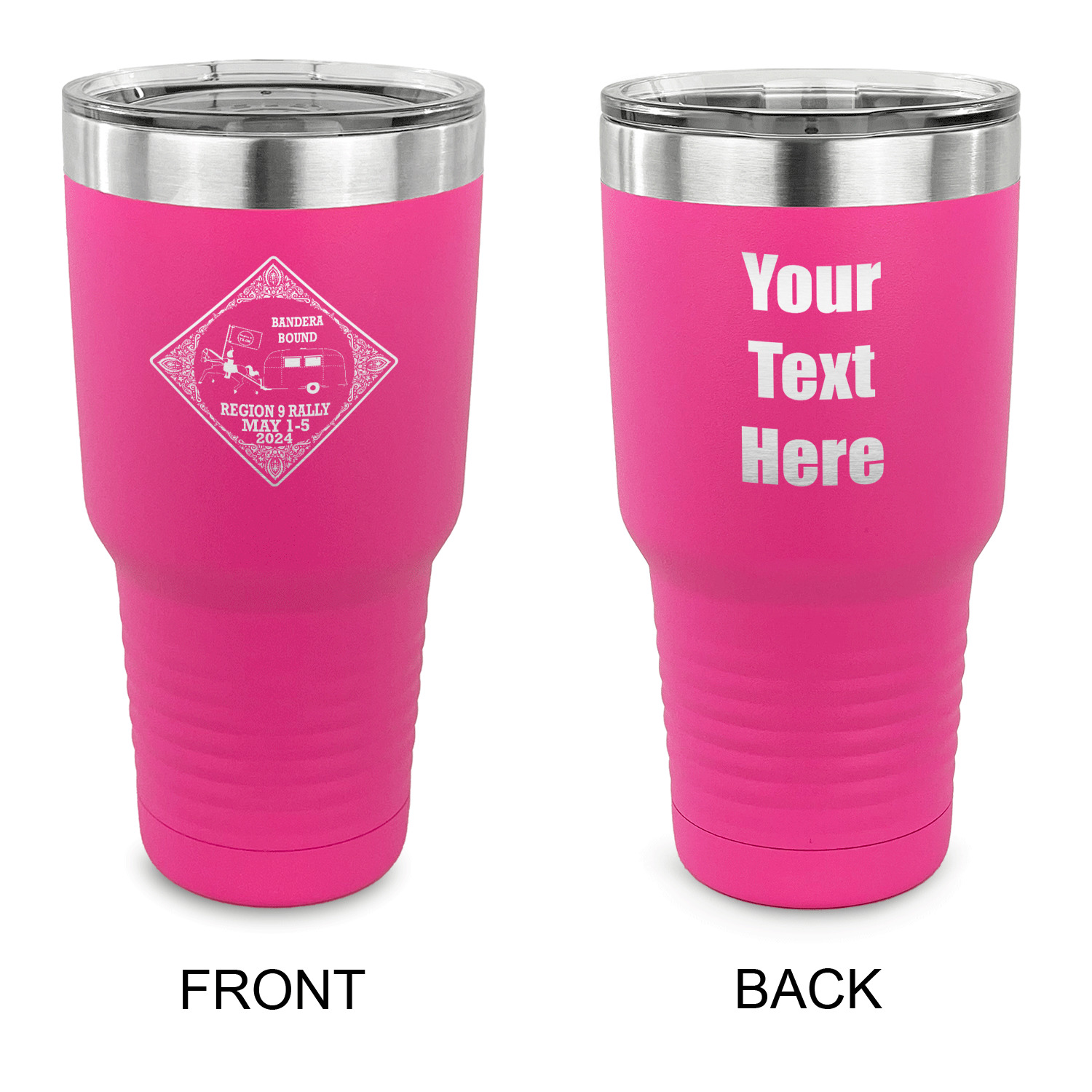 With the 5 colors - Black, Navy, Red, Pink and Coral, you are sure to find a cup to fit your personality. You can chose to engrave on the front or the front and back of the cup. Use our design studio to design your own cup and we laser engrave it for you.