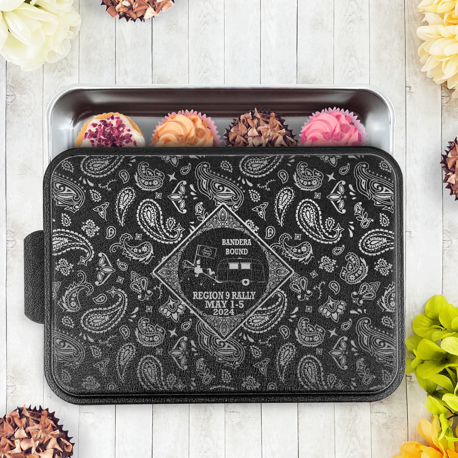 With the lid laser etched with the design of your choice these get the fully customized touch unique to you. The possibilities are endless when you go to design your own cake pan lid. With our design library you can make the design of your dreams come true.