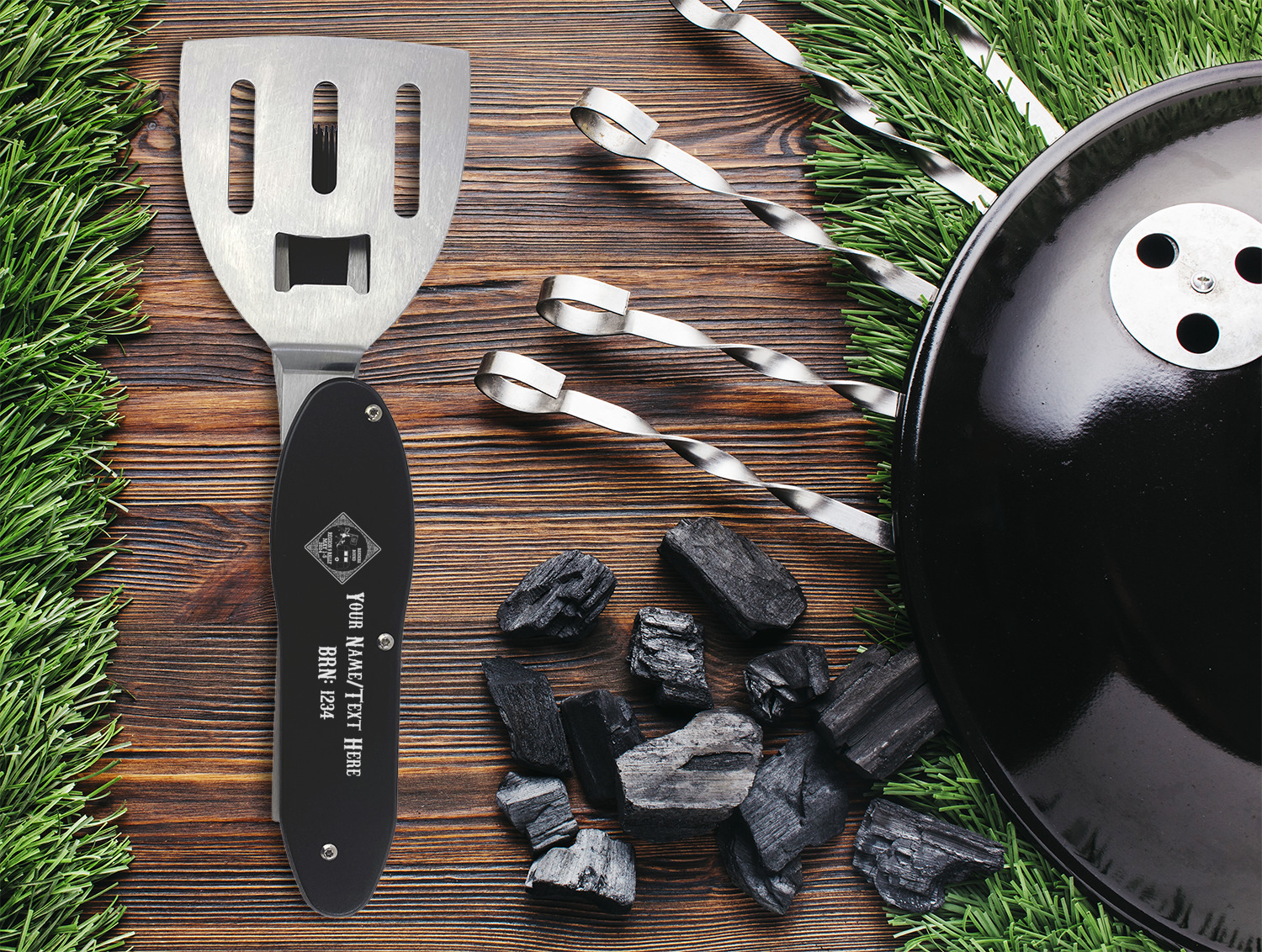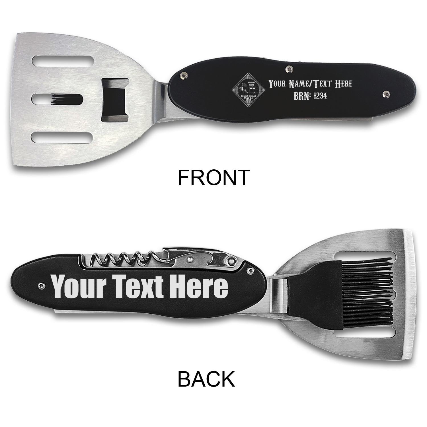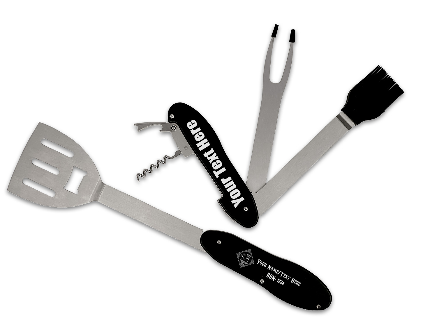 Utensil set includes a removable spatula, bar-b-q fork, basting brush, corkscrew for opening wine bottles and a bottle opener for other drinks. The black plastic handle can be customized so you can make this gift special for your favorite outdoor cook. Includes a white gift box.