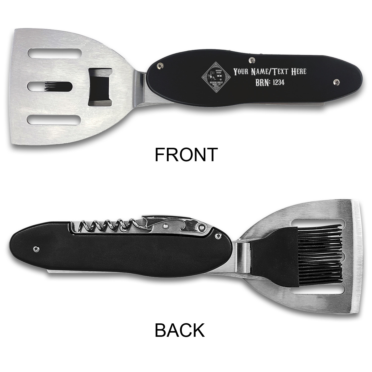 Utensil set includes a removable spatula, bar-b-q fork, basting brush, corkscrew for opening wine bottles and a bottle opener for other drinks. The black plastic handle can be customized so you can make this gift special for your favorite outdoor cook. Includes a white gift box.
