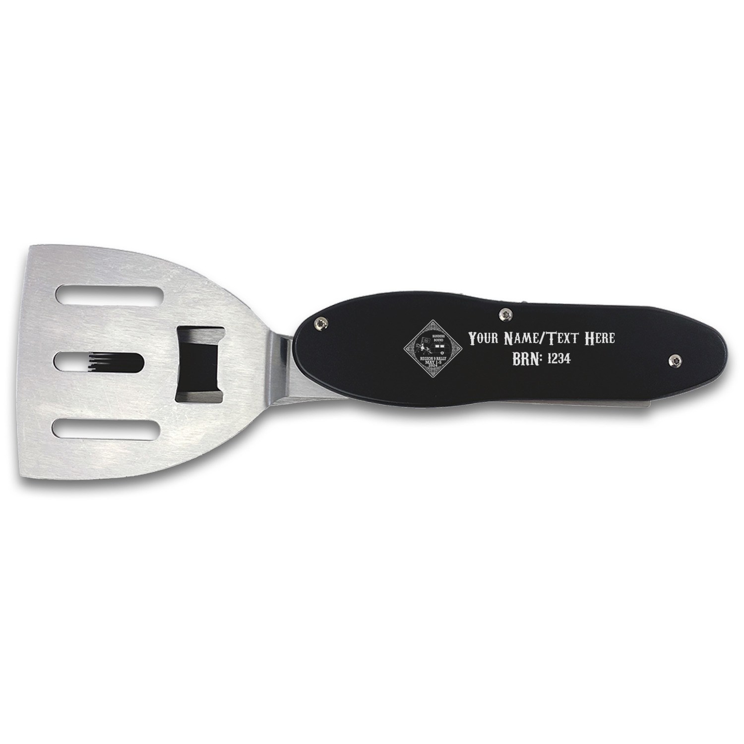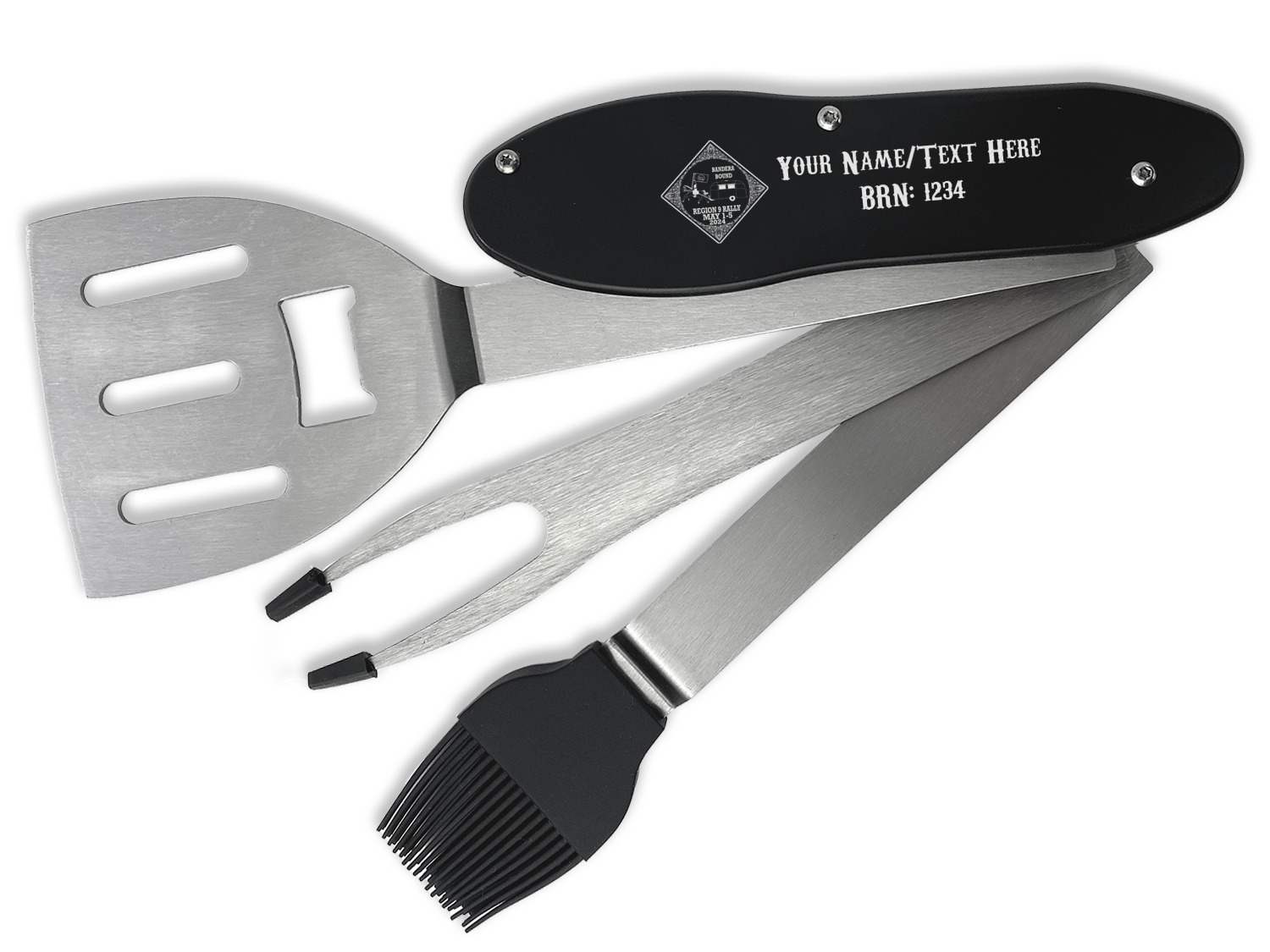 Utensil set includes a removable spatula, bar-b-q fork, basting brush, corkscrew for opening wine bottles and a bottle opener for other drinks. The black plastic handle can be customized so you can make this gift special for your favorite outdoor cook. Includes a white gift box.