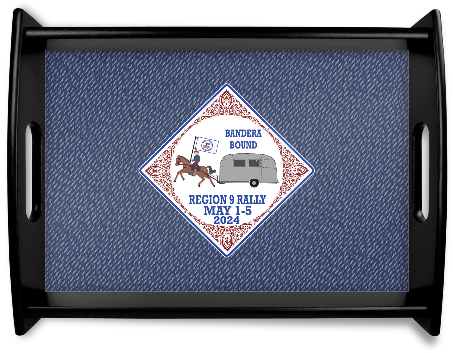 This serving tray with handles features square edges and two rounded sides, creating a very modern look. Each side is fabricated from a beautifully cut, natural wood. The bottom of the interior of the tray displays your customized design in bright, vibrant color. The tray is sold in both a black color and a natural wood look. Each variation of the wood serving tray has two sizes: Small, which is 14" x 10" x 2.25", and Large, which is 19.5" x 13.5" x 2.75".