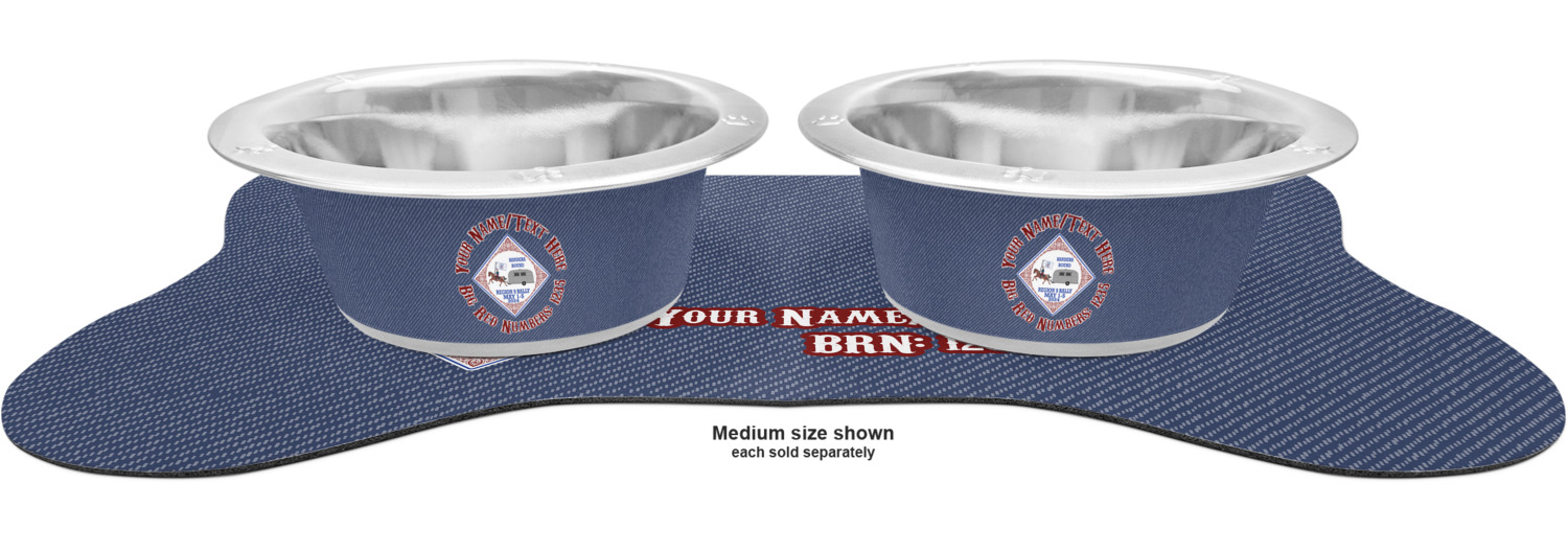 The top of this mat displays your custom design, as it is printed on polyester. To prevent slippage, the underside of the mat is made of rubber. We offer a small dog food mat, suitable for smaller dogs and a large dog food mat for bigger breeds. The small dog food mat is approximately 19 by 13 inches, while the large dog feeding mat measures at approximately 26.75 by 18 inches. Both personalized mats are ideally sized to fit two dog bowls.