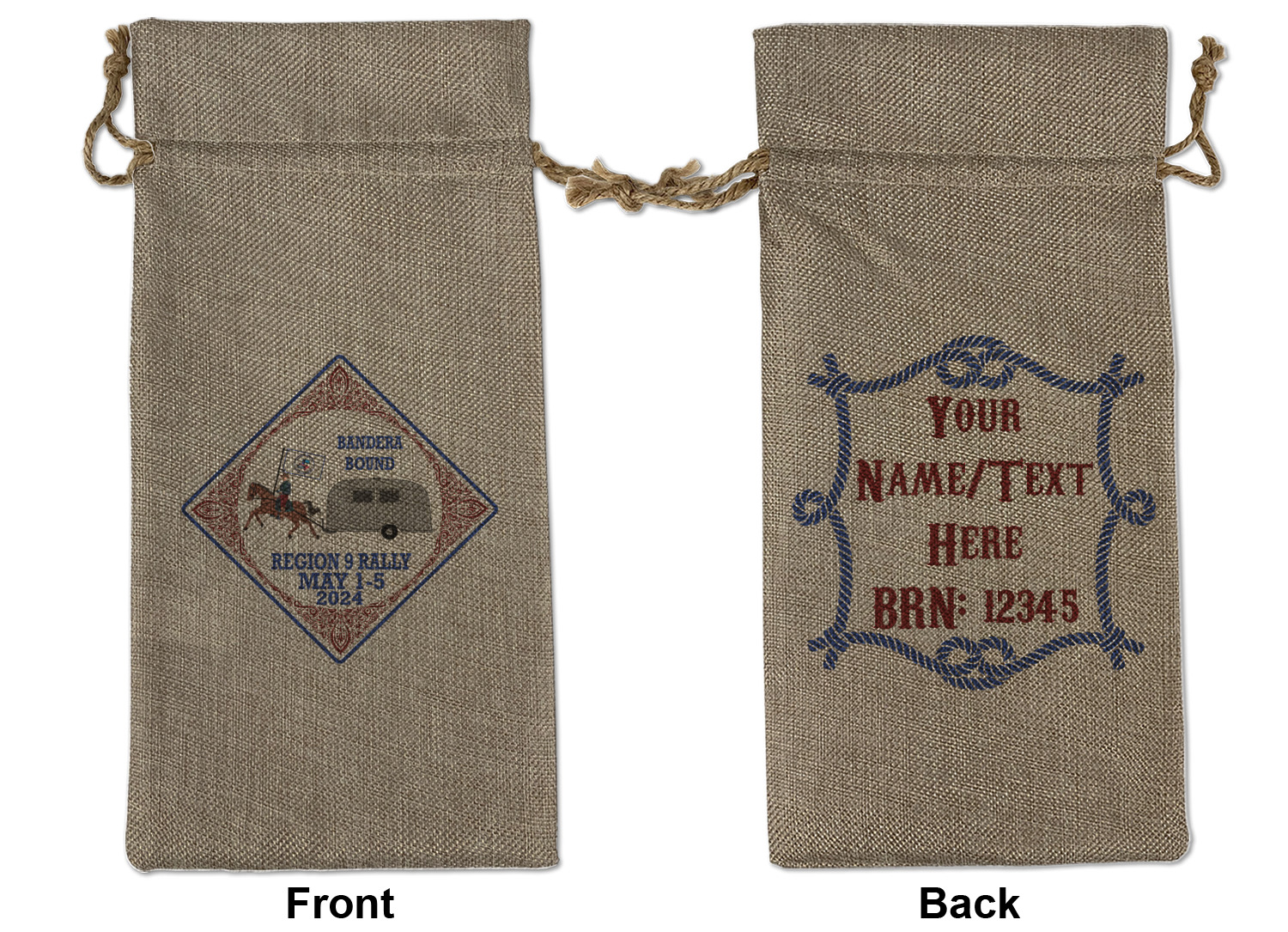 We sell our Burlap Gift Bags in 3 variant sized bags. Made with burlap polyester, each personalized bag can be secured with a twine drawstring pull. Your custom design is available to print on one side or both sides - completely up to you! The sizes of the bags measure approximately 4.5" x 6.5" for the smallest size, 6.5" x 8.0" for the medium size, and 6.5" x 13.5" for the large-sized bag.