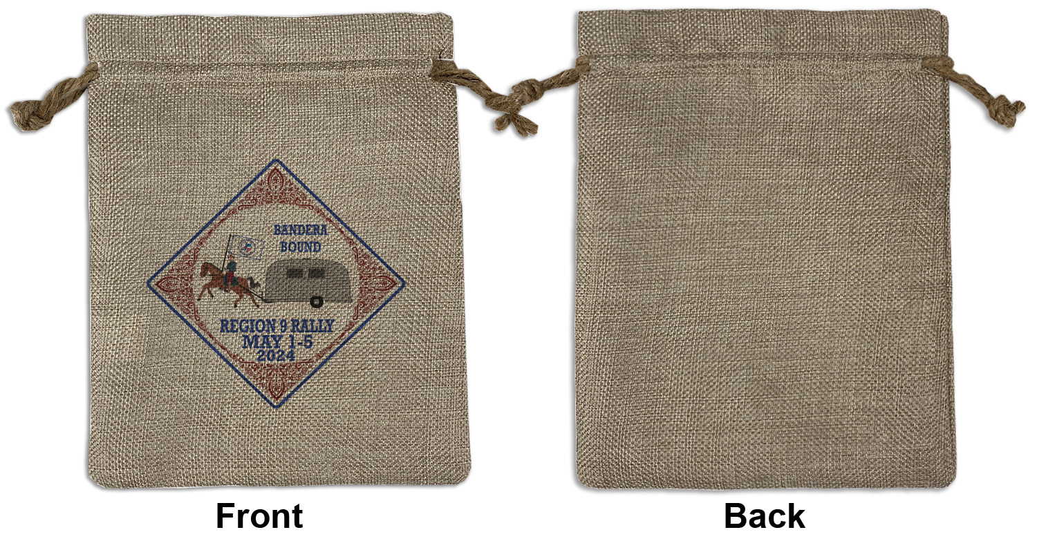 We sell our Burlap Gift Bags in 3 variant sized bags. Made with burlap polyester, each personalized bag can be secured with a twine drawstring pull. Your custom design is available to print on one side or both sides - completely up to you! The sizes of the bags measure approximately 4.5" x 6.5" for the smallest size, 6.5" x 8.0" for the medium size, and 6.5" x 13.5" for the large-sized bag.