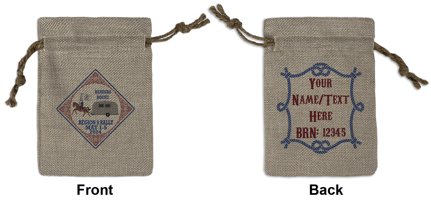We sell our Burlap Gift Bags in 3 variant sized bags. Made with burlap polyester, each personalized bag can be secured with a twine drawstring pull. Your custom design is available to print on one side or both sides - completely up to you! The sizes of the bags measure approximately 4.5" x 6.5" for the smallest size, 6.5" x 8.0" for the medium size, and 6.5" x 13.5" for the large-sized bag.