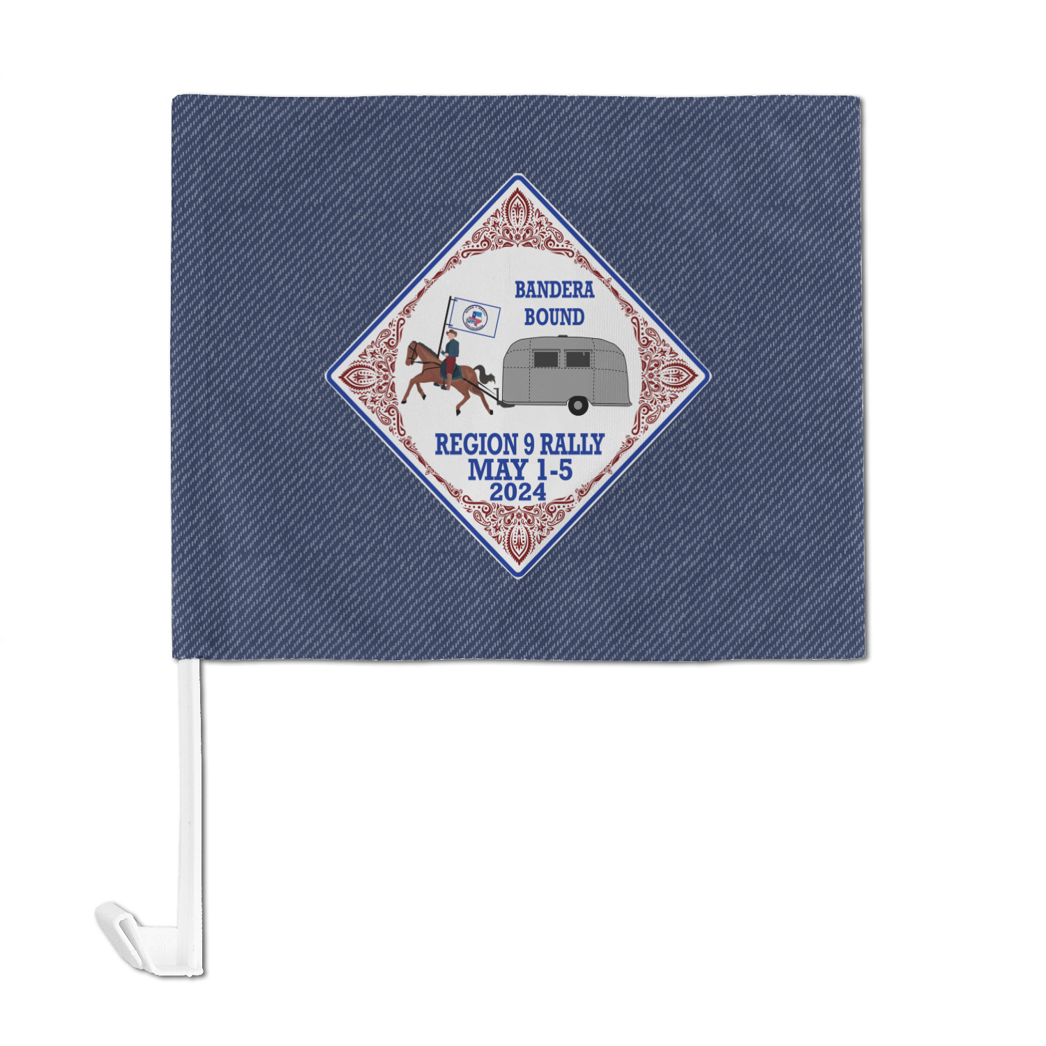Our personalized flags are made from a durable, yet lightweight cloth that will proudly bear your logo or design of choice, while withstanding the outside elements. We have two size options - 8" x 11" and 11" x 15". Both come with a flag pole which includes a clip that secures the pole to the side window, whether it is rolled up or down. The flags are printed on both sides to display your design from all directions.