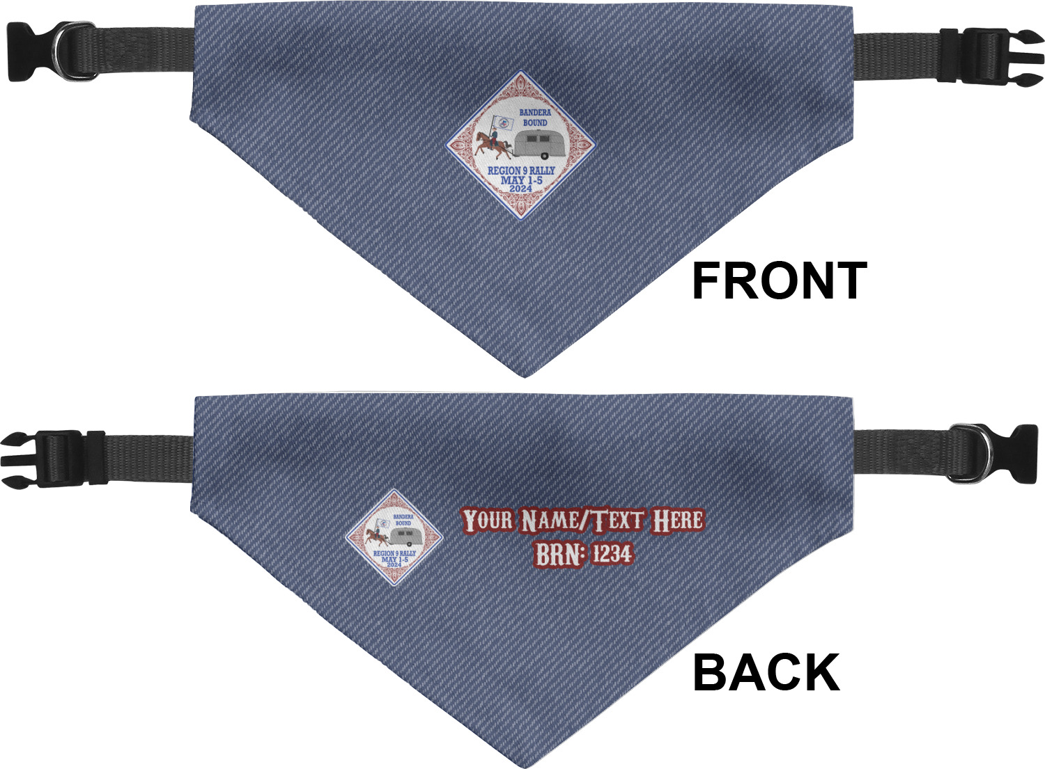 We print the front and back of these dog bandanas with your customized design. The bandana itself is made from a durable polyester, sewn together with a gap large enough to accommodate any collar. Regardless, the bandana includes a plain black, canvas collar with plastic snaps, that can easily be removed if desired. These dog bandana collars are available in four sizes: small, medium, large, and extra large. Please see our sizing chart for more information regarding the dimensions of each size.