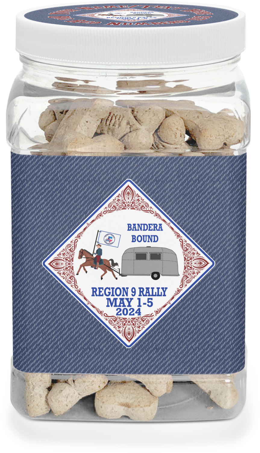 This half gallon jar, made from a sturdy plastic, is the perfect way to keep treats from any naughty pet paws, while still keeping them ready on hand for when your pup performs an impressive trick. This dog cookie jar features a screw-on, white lid that displays your personalized design on a vinyl sticker. We apply another customized sticker that wraps around the front and sides of the jar. Our dog treat jar also has indentations on the rear ends of the sides, which allows for convenient handling, and its square frame allows for easy storage.