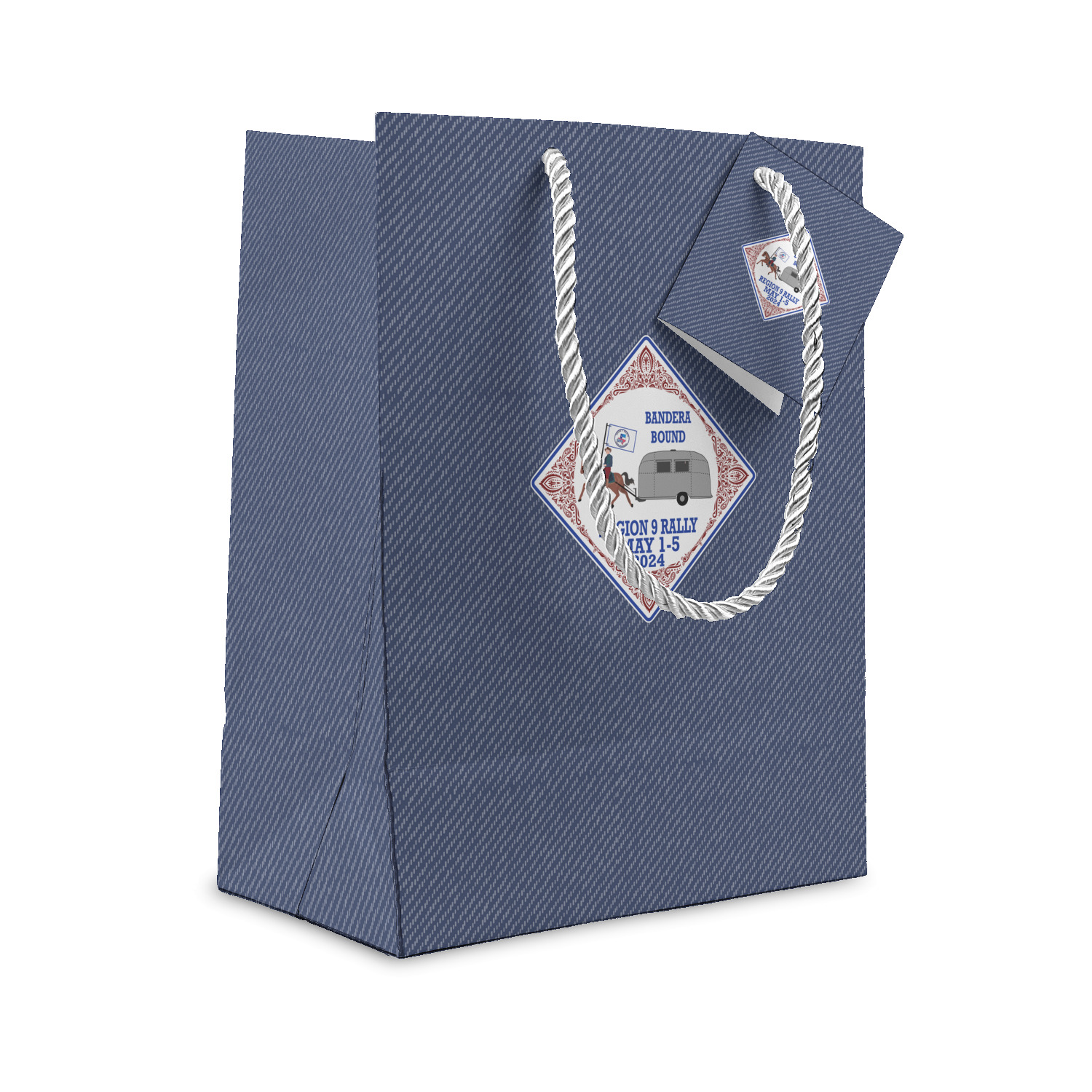 Our gift bags are digitally printed in full color on a premium heavy weight paper. The bags are then cut, scored & folded. The silver rope handles are then attached to the gift bag, along with the gift card.