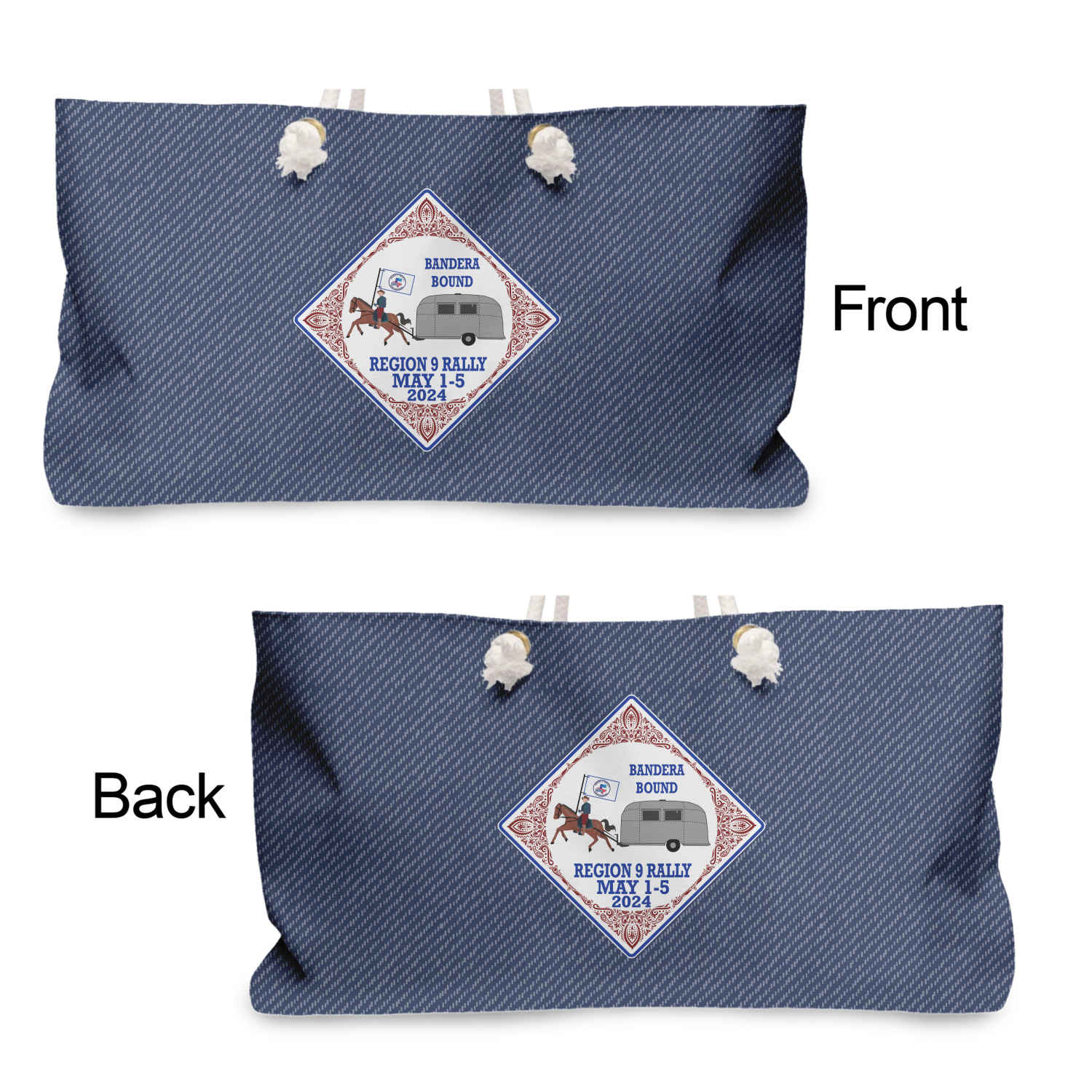 Our oversized weekender tote with rope handles is perfect for your weekend at the beach or on the town. This large tote are 24" W X 13" H, with a 5" gusset and a 27" thick rope handles with a knot that is put through a grommeted brass hole.