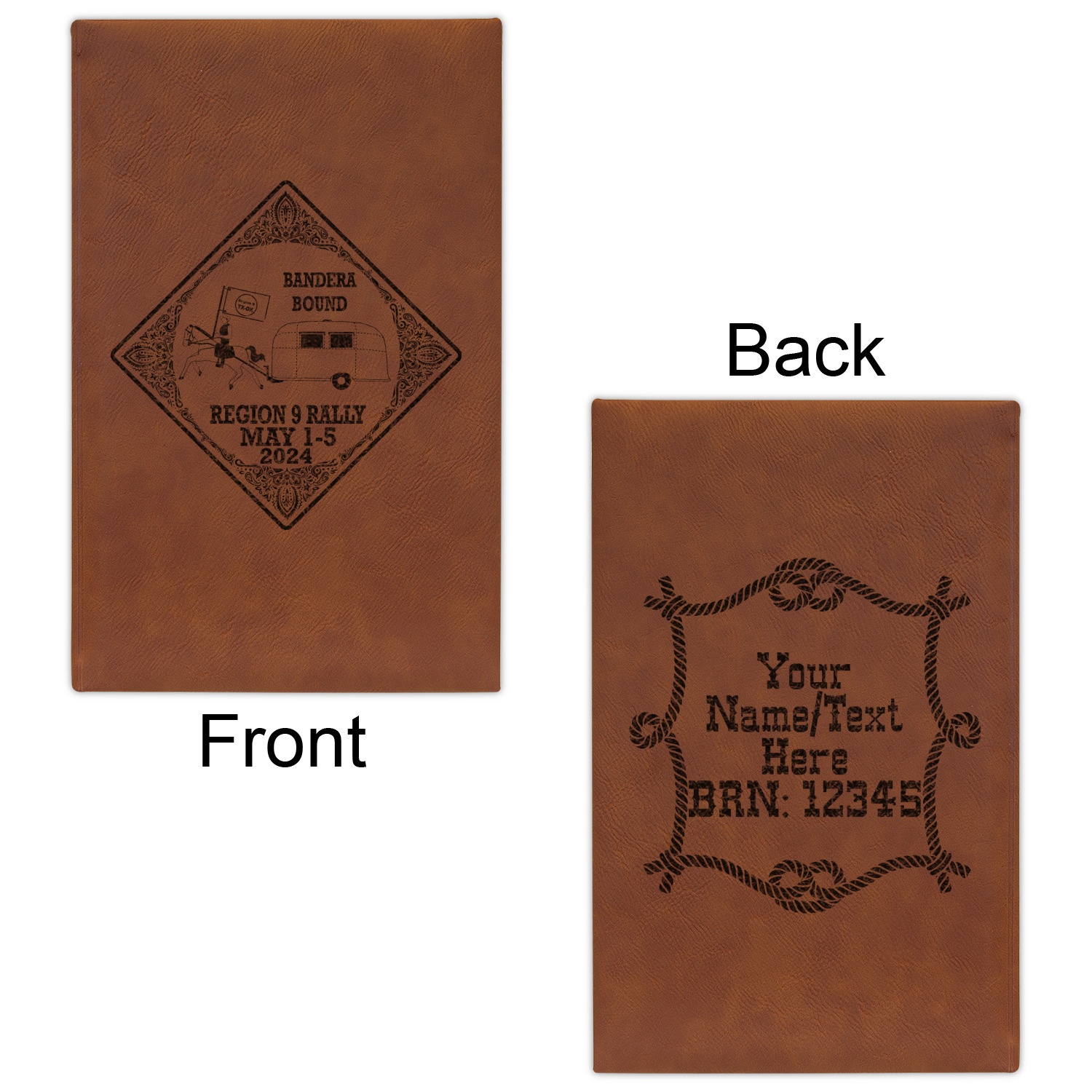 The faux leather covers are a rich cognac / rawhide color and can be customized with your design. From a simple name or monogram or a logo to a detailed mandala - the choice for customization & personalization is truly yours. Customize one of our designs or upload your own.