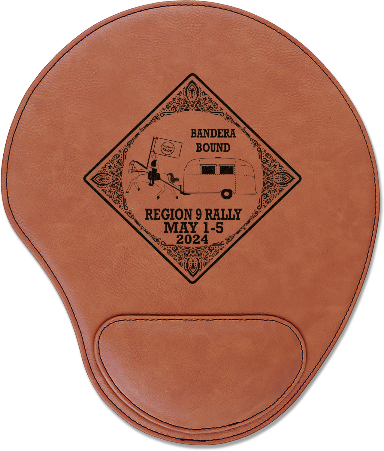 In a rounded shape, this mouse pad is made of a luxurious, cognac-colored leatherette. The nature of this material allows your mouse to glide smoothly across its surface. Strong stitching lines the edges to guarantee stability and strength. As added support for tired wrists, your personalized mouse pad features a supportive wrist rest at its bottom. This model measures at 10.25" x 9", while its wrist pad is approximately 5" x 2.75", with a thickness of 0.75". Your personalized design is laser engraved into the front face of this mouse pad.