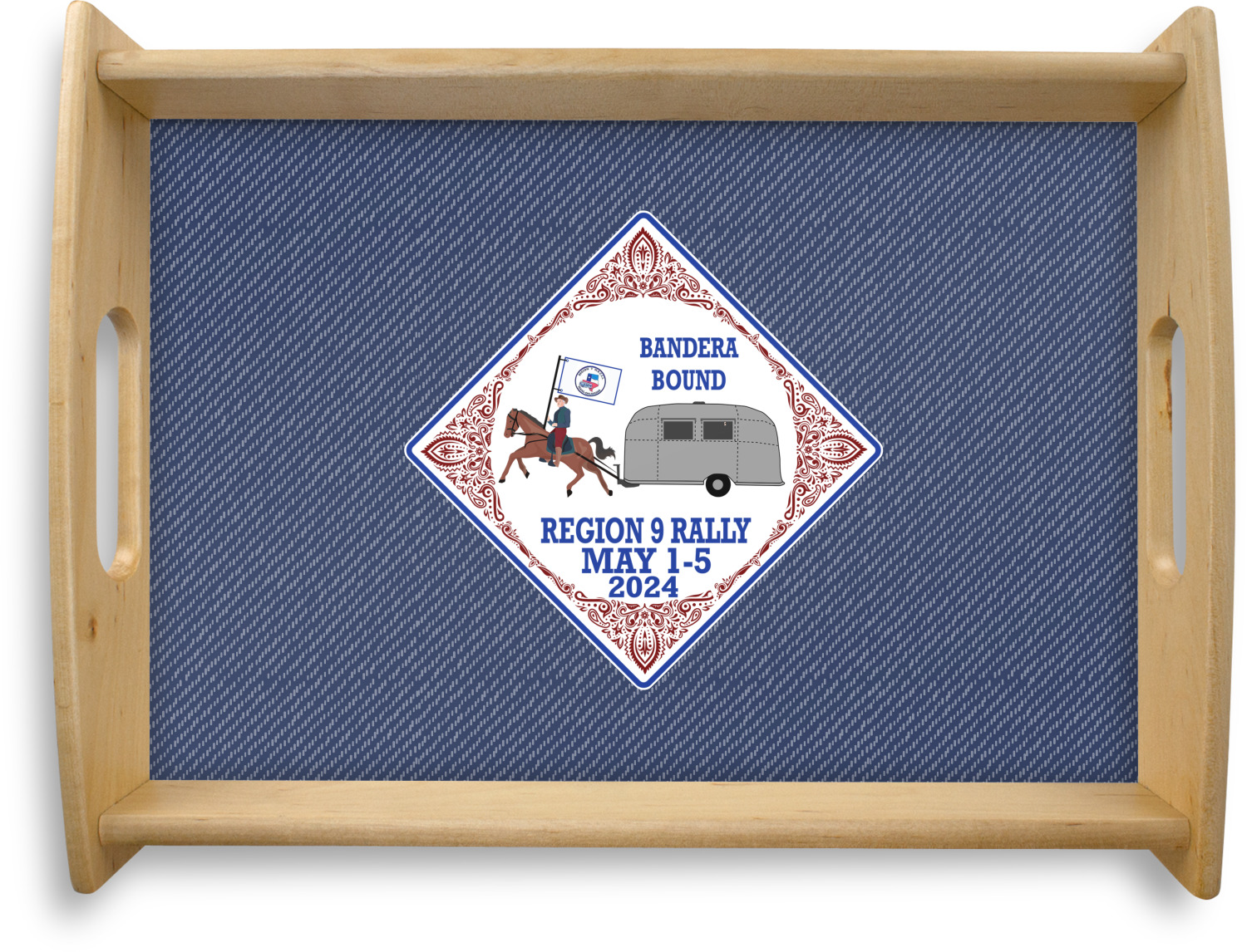 This serving tray with handles features square edges and two rounded sides, creating a very modern look. Each side is fabricated from a beautifully cut, natural wood. The bottom of the interior of the tray displays your customized design in bright, vibrant color. The tray is sold in both a black color and a natural wood look. Each variation of the wood serving tray has two sizes: Small, which is 14" x 10" x 2.25", and Large, which is 19.5" x 13.5" x 2.75".