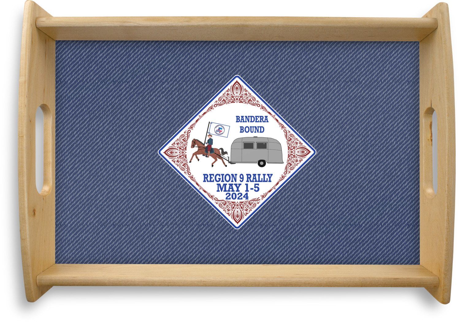 This serving tray with handles features square edges and two rounded sides, creating a very modern look. Each side is fabricated from a beautifully cut, natural wood. The bottom of the interior of the tray displays your customized design in bright, vibrant color. The tray is sold in both a black color and a natural wood look. Each variation of the wood serving tray has two sizes: Small, which is 14" x 10" x 2.25", and Large, which is 19.5" x 13.5" x 2.75".