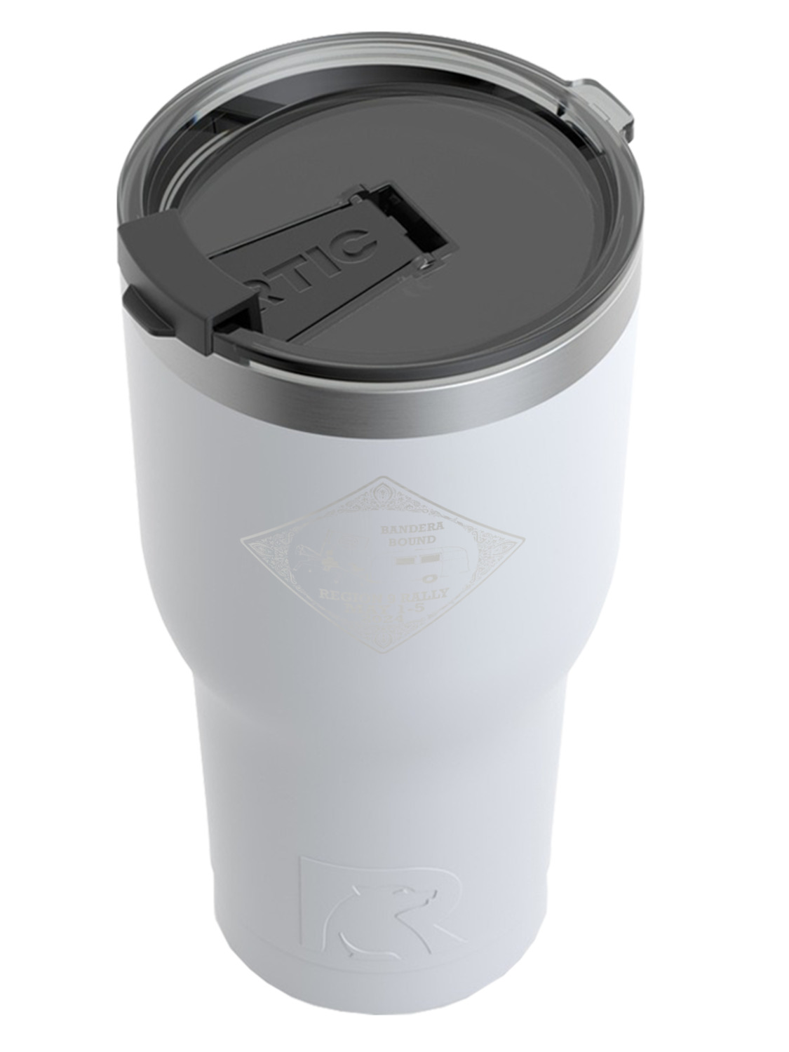 These RTIC cups are crafted from an 18/8 stainless steel, making them durable and heavy-duty. They are also double-walled and vacuum-sealed, making them the perfect insulated coffee tumbler! At 4 by 4.5 by 8 inches, these tumblers can hold up to 30 ounces of liquid, and they will keep your beverage hot or cold for hours! Also, the tapered shape and slender bottom makes these custom tumbler cups easy to grip, and can fit in most car cup holders! The tumbler is accompanied by a clear lid with a tab that can be easily flipped back when you need to drink. The RTIC logo appears on the neck and lid of the customizable tumblers.