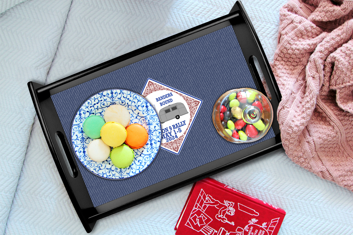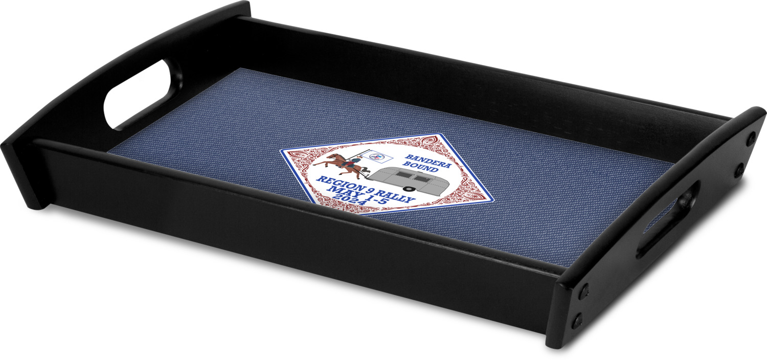 This serving tray with handles features square edges and two rounded sides, creating a very modern look. Each side is fabricated from a beautifully cut, natural wood. The bottom of the interior of the tray displays your customized design in bright, vibrant color. The tray is sold in both a black color and a natural wood look. Each variation of the wood serving tray has two sizes: Small, which is 14" x 10" x 2.25", and Large, which is 19.5" x 13.5" x 2.75".