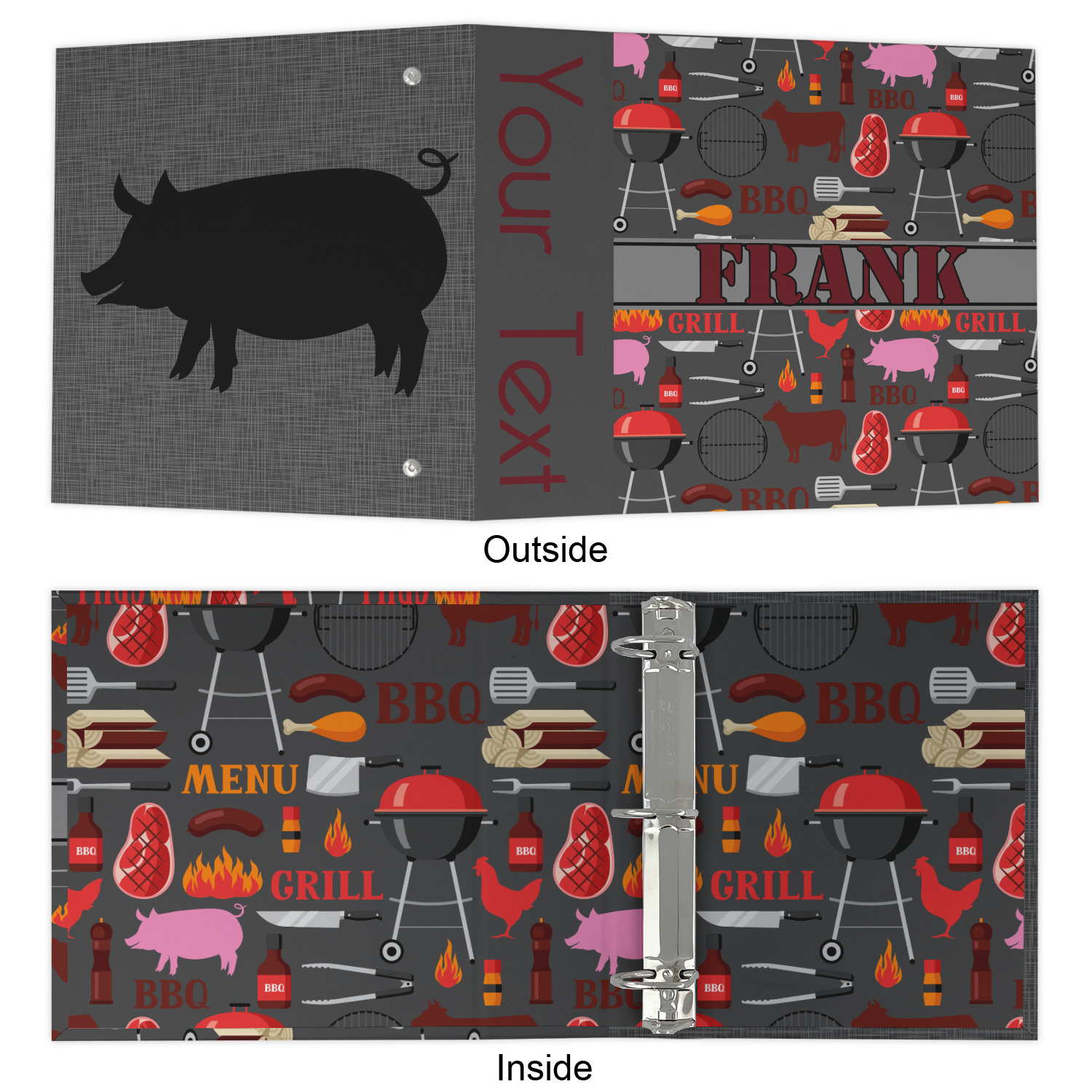 This design features pigs, cows, grills, and more on a simple grey background. There are wonderful contrasting reds, oranges, and charcoals in this manly design. The ribbon across the middle fits your personalization right in the middle.