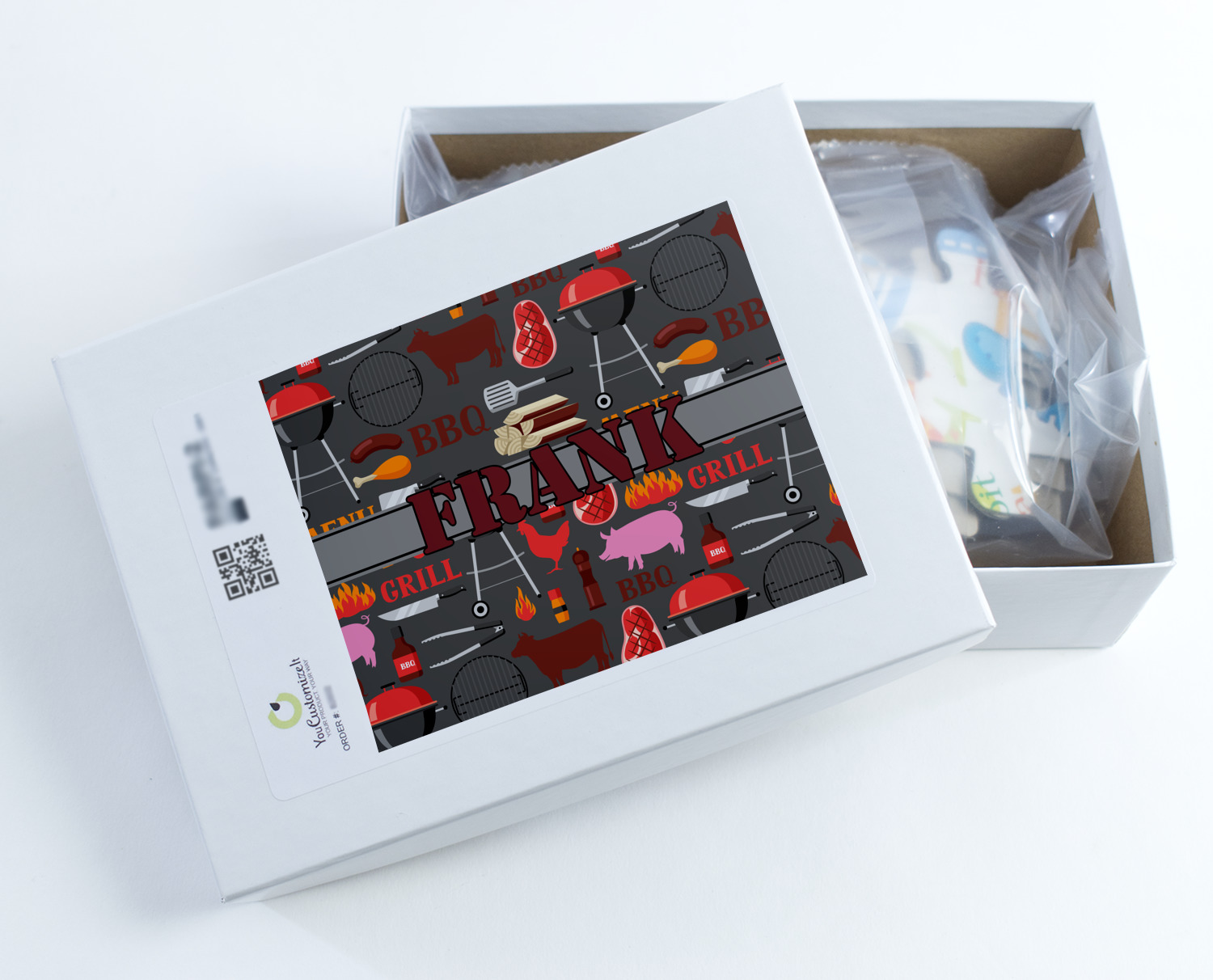 This design features pigs, cows, grills, and more on a simple grey background. There are wonderful contrasting reds, oranges, and charcoals in this manly design. The ribbon across the middle fits your personalization right in the middle.