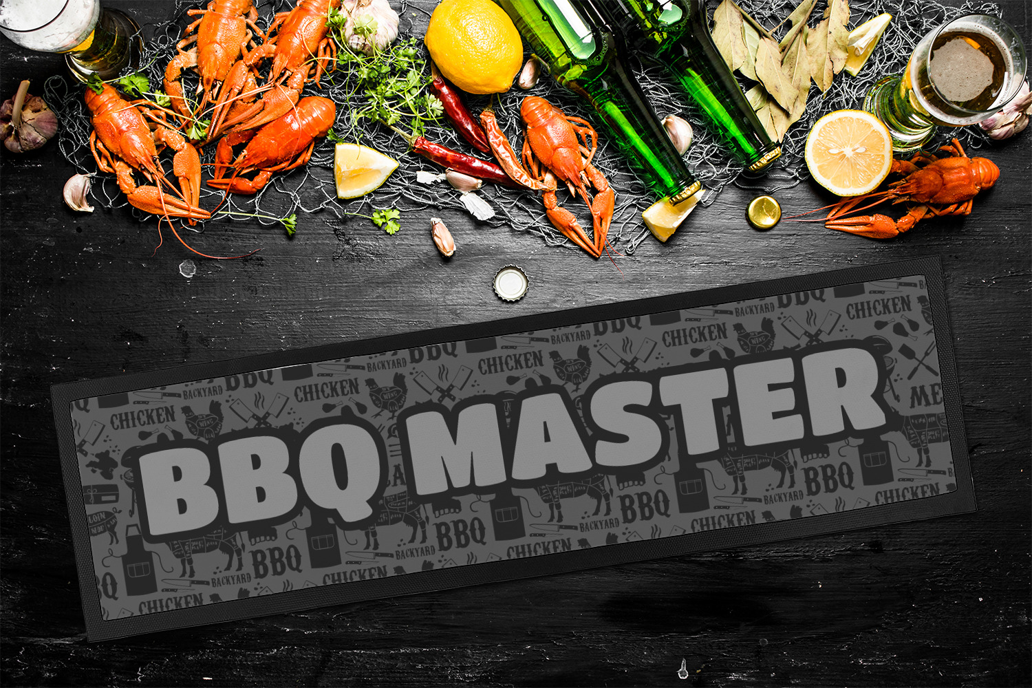 This design features pigs, cows, grills, and more on a simple grey background. There are wonderful contrasting reds, oranges, and charcoals in this manly design. The ribbon across the middle fits your personalization right in the middle.