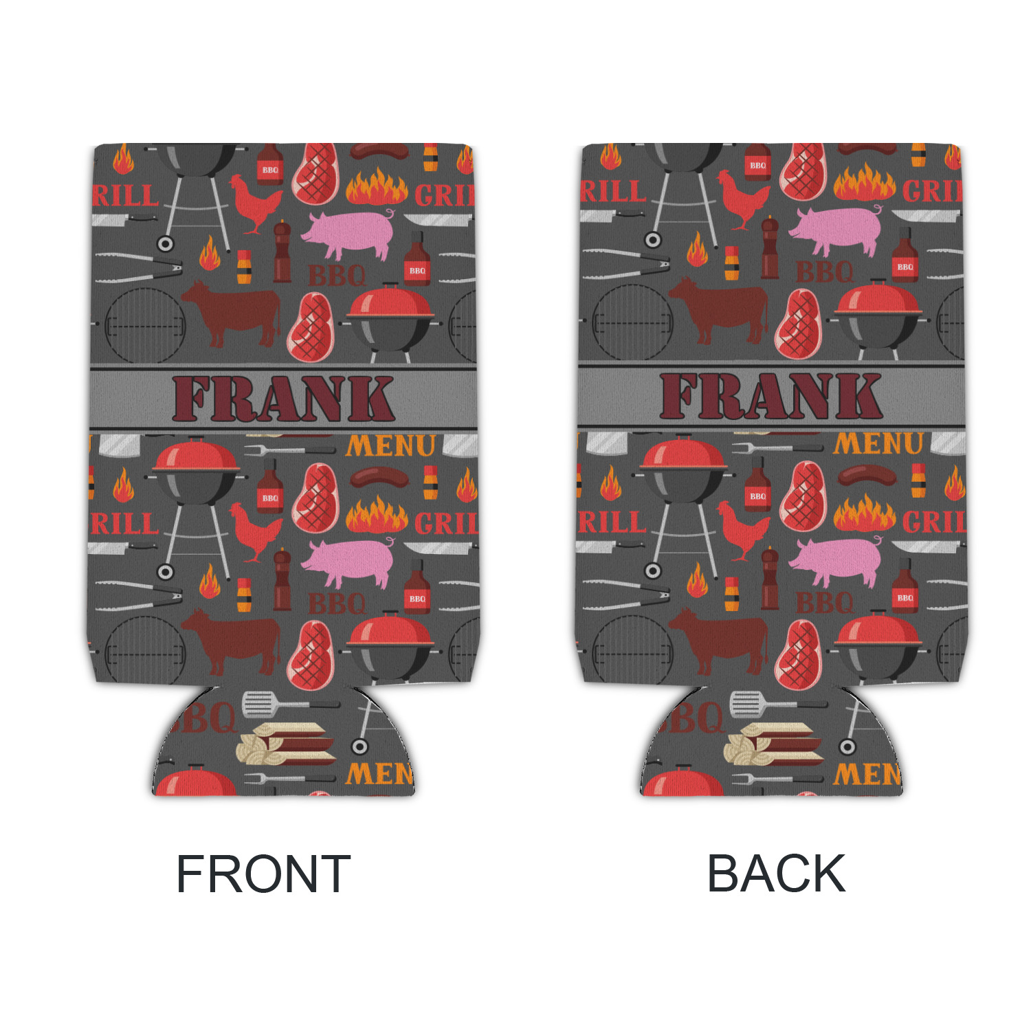 This design features pigs, cows, grills, and more on a simple grey background. There are wonderful contrasting reds, oranges, and charcoals in this manly design. The ribbon across the middle fits your personalization right in the middle.