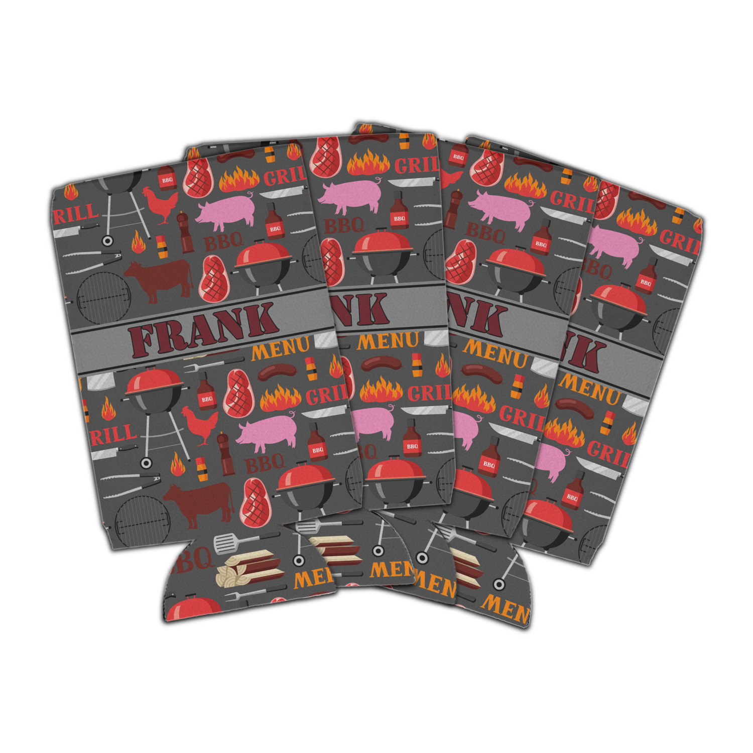 This design features pigs, cows, grills, and more on a simple grey background. There are wonderful contrasting reds, oranges, and charcoals in this manly design. The ribbon across the middle fits your personalization right in the middle.