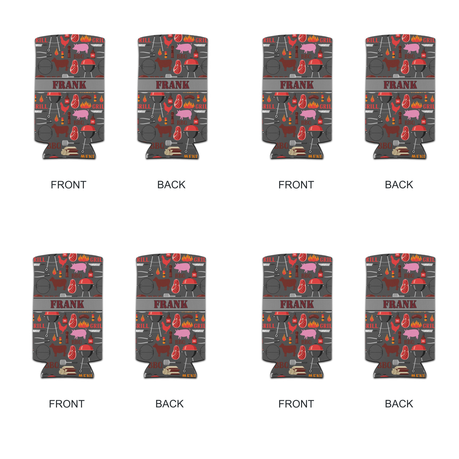 This design features pigs, cows, grills, and more on a simple grey background. There are wonderful contrasting reds, oranges, and charcoals in this manly design. The ribbon across the middle fits your personalization right in the middle.