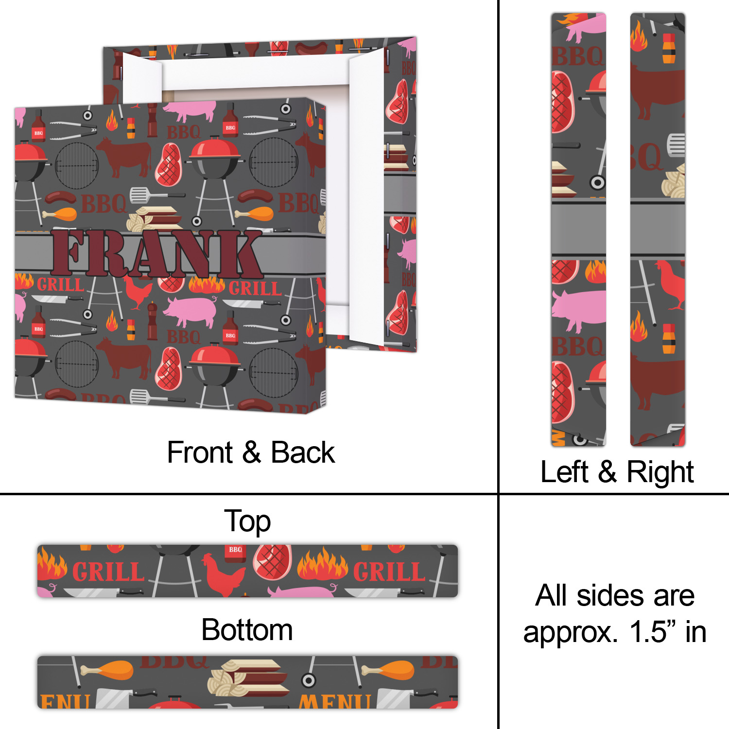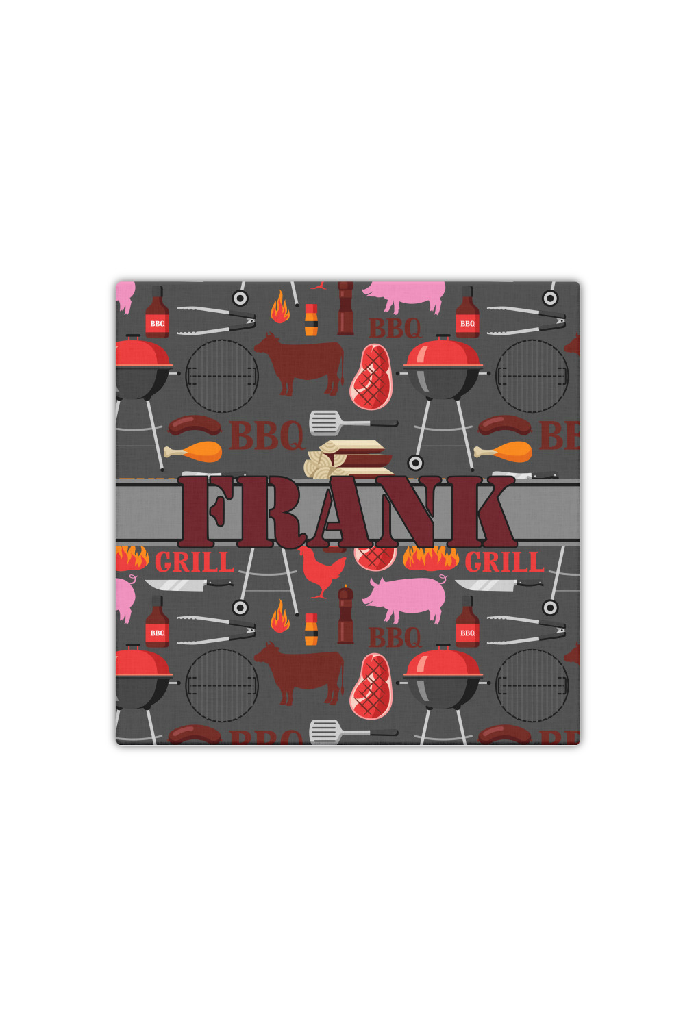 This design features pigs, cows, grills, and more on a simple grey background. There are wonderful contrasting reds, oranges, and charcoals in this manly design. The ribbon across the middle fits your personalization right in the middle.
