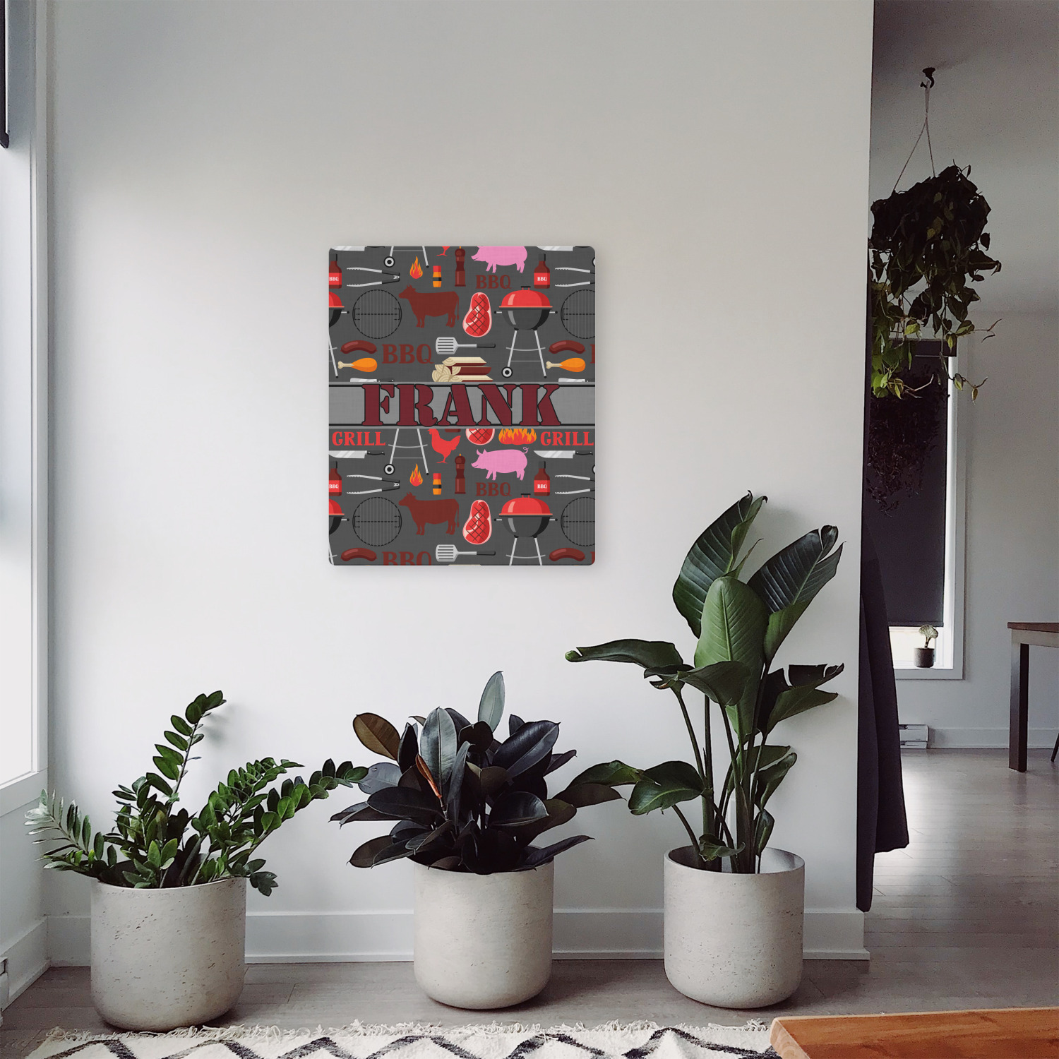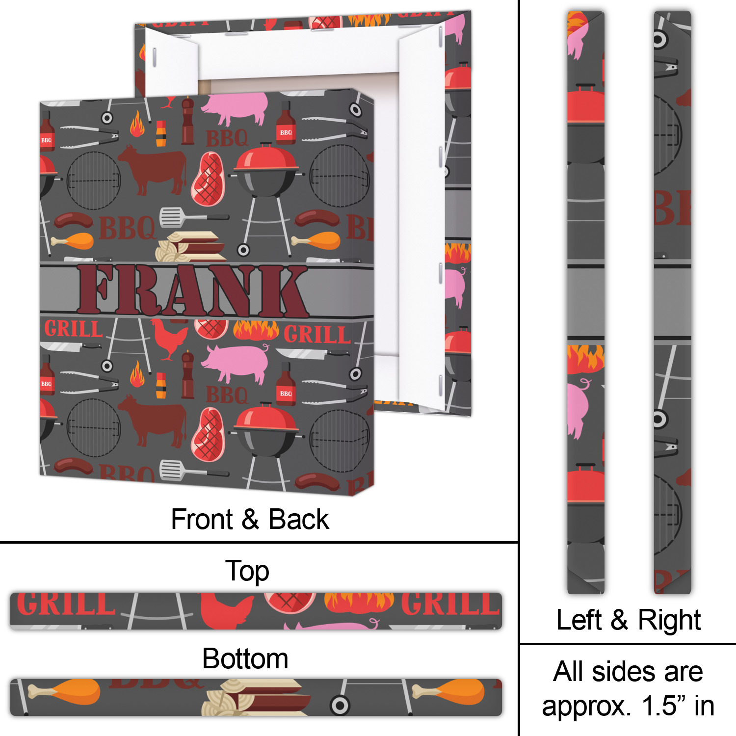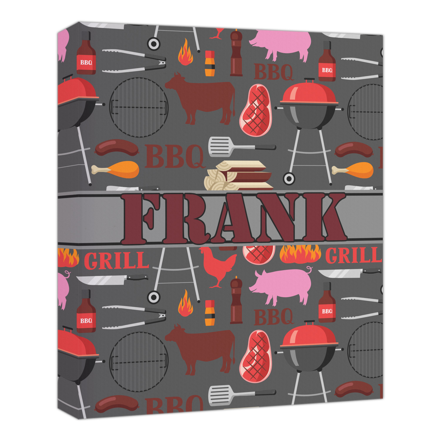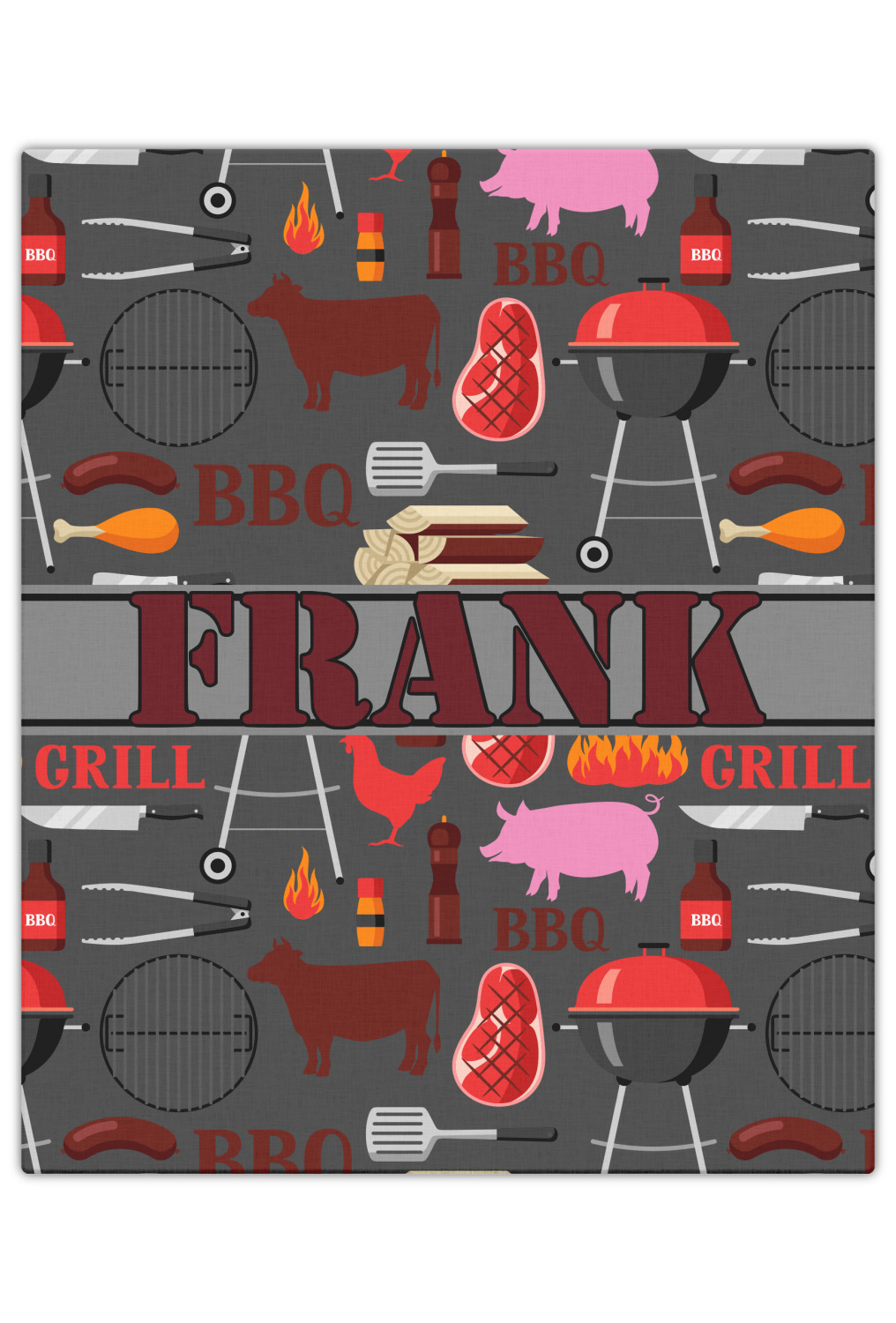 This design features pigs, cows, grills, and more on a simple grey background. There are wonderful contrasting reds, oranges, and charcoals in this manly design. The ribbon across the middle fits your personalization right in the middle.