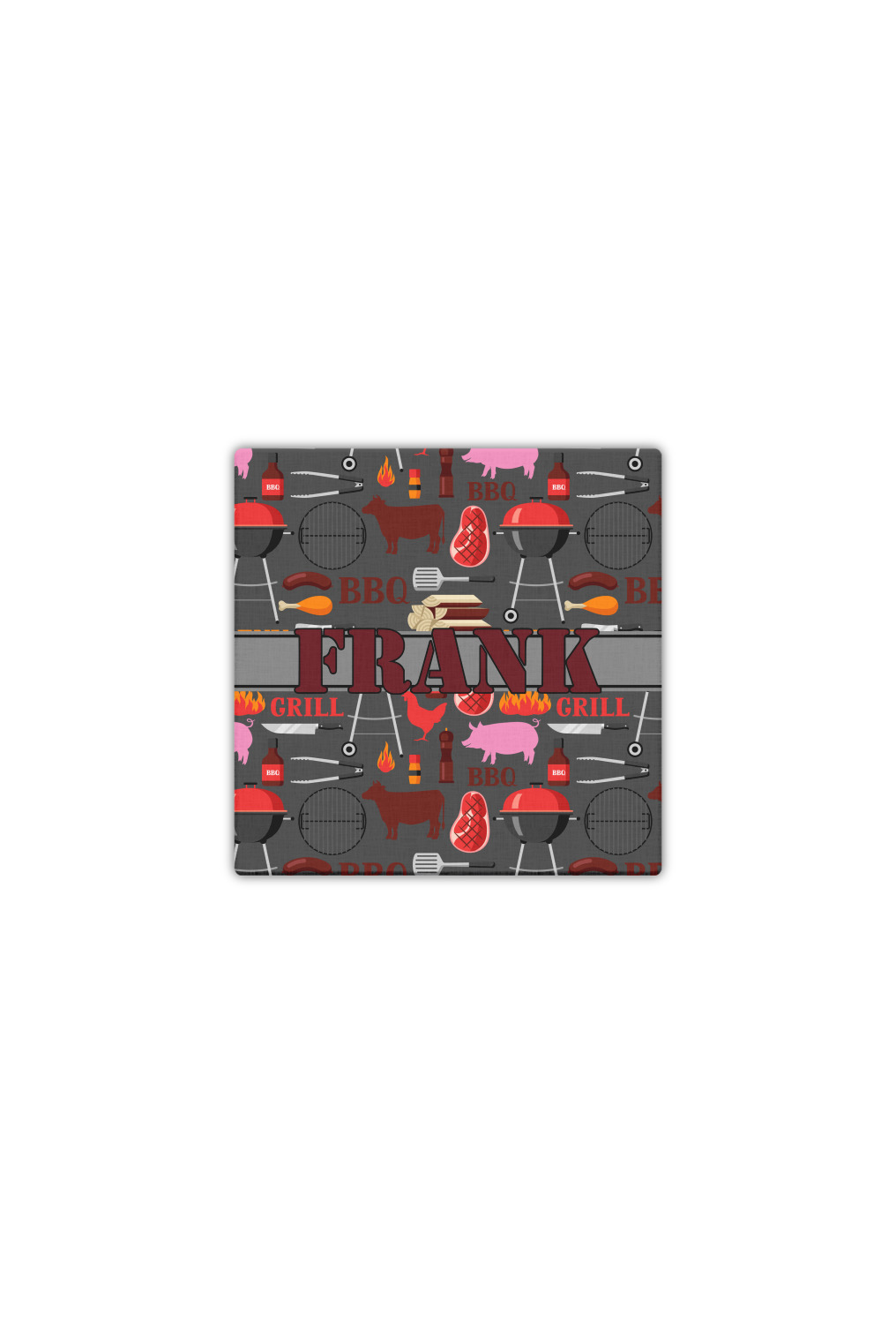This design features pigs, cows, grills, and more on a simple grey background. There are wonderful contrasting reds, oranges, and charcoals in this manly design. The ribbon across the middle fits your personalization right in the middle.