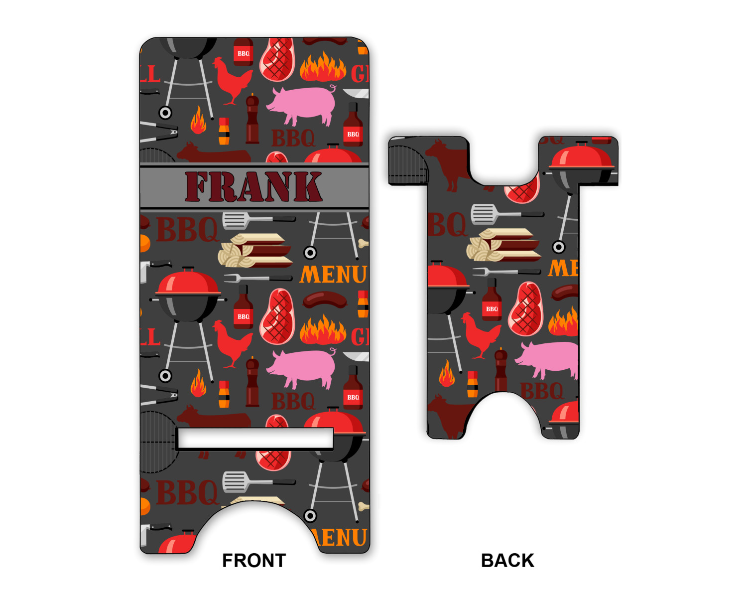 This design features pigs, cows, grills, and more on a simple grey background. There are wonderful contrasting reds, oranges, and charcoals in this manly design. The ribbon across the middle fits your personalization right in the middle.