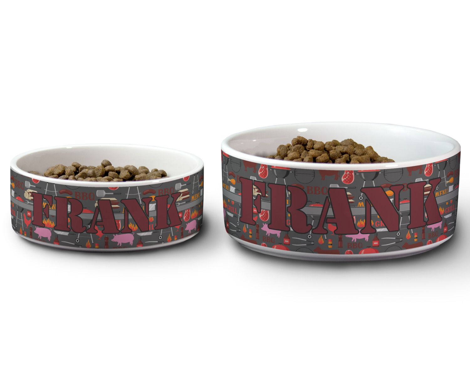 We carry these custom dog bowls in two available sizes: medium and large.The medium is 6 inches in diameter and 2.5 inches tall, and can therefore suit pets who eat up to 2.5 cups of food per meal. The large pet bowl is 7 inches in diameter and 3 inches tall, and suits pets who require up to 4.5 cups of food per meal.
