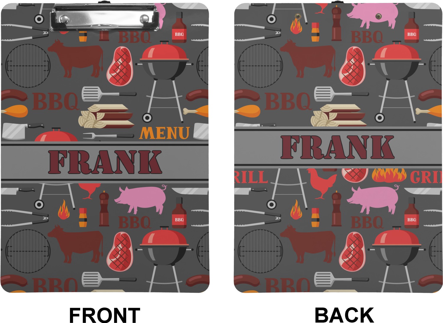 This design features pigs, cows, grills, and more on a simple grey background. There are wonderful contrasting reds, oranges, and charcoals in this manly design. The ribbon across the middle fits your personalization right in the middle.
