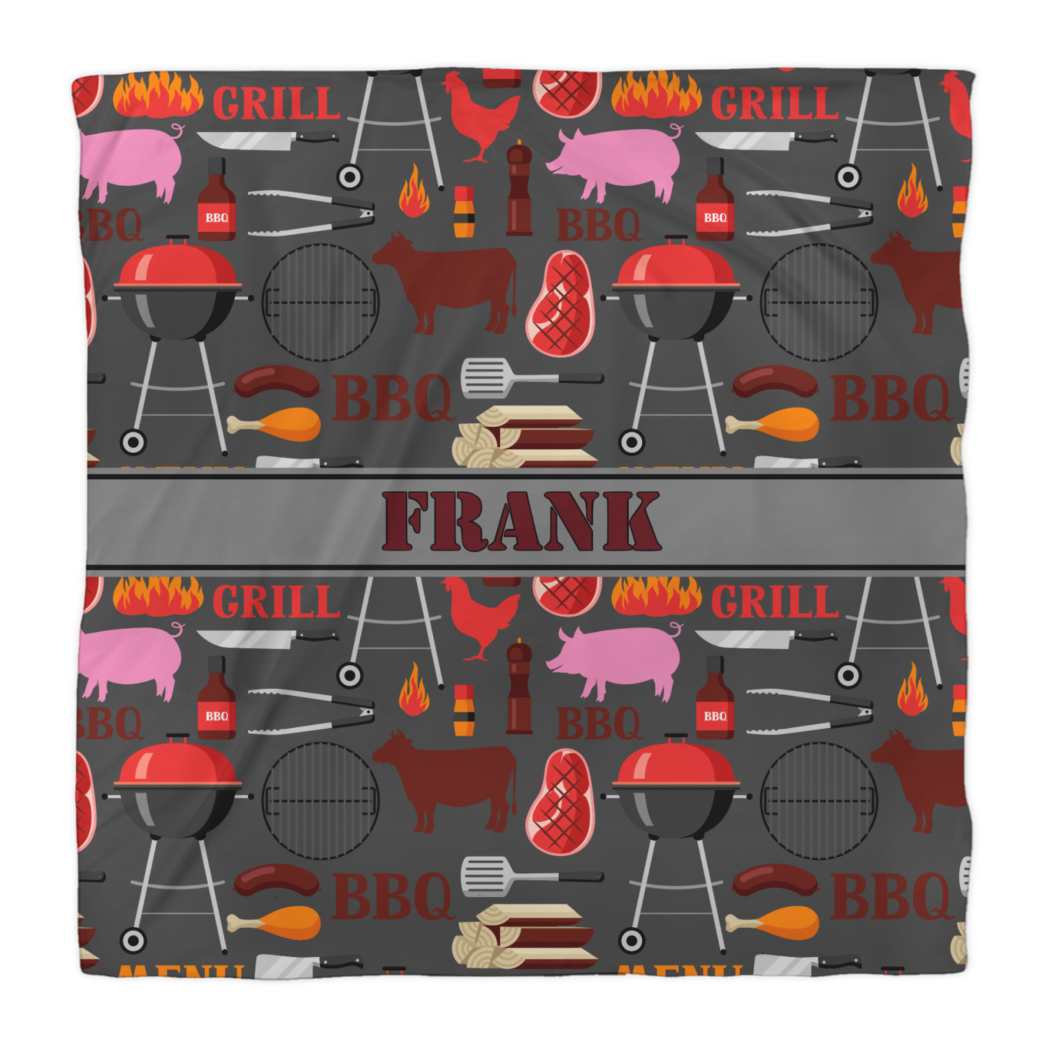 This design features pigs, cows, grills, and more on a simple grey background. There are wonderful contrasting reds, oranges, and charcoals in this manly design. The ribbon across the middle fits your personalization right in the middle.
