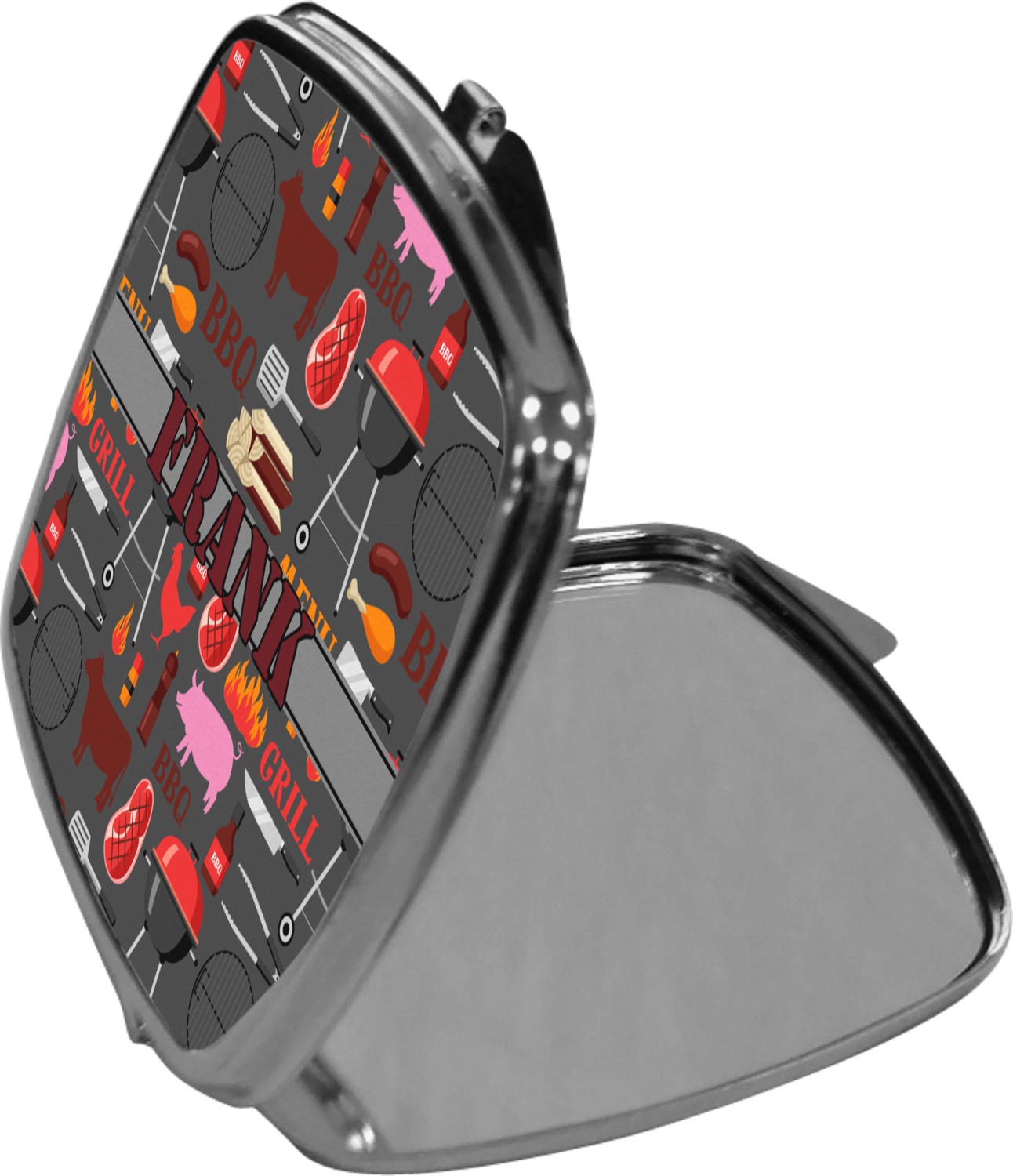 Our compact mirrors are customized with your design on one side. The other side is patterned silver tone metal. Inside, there are two mirrors.