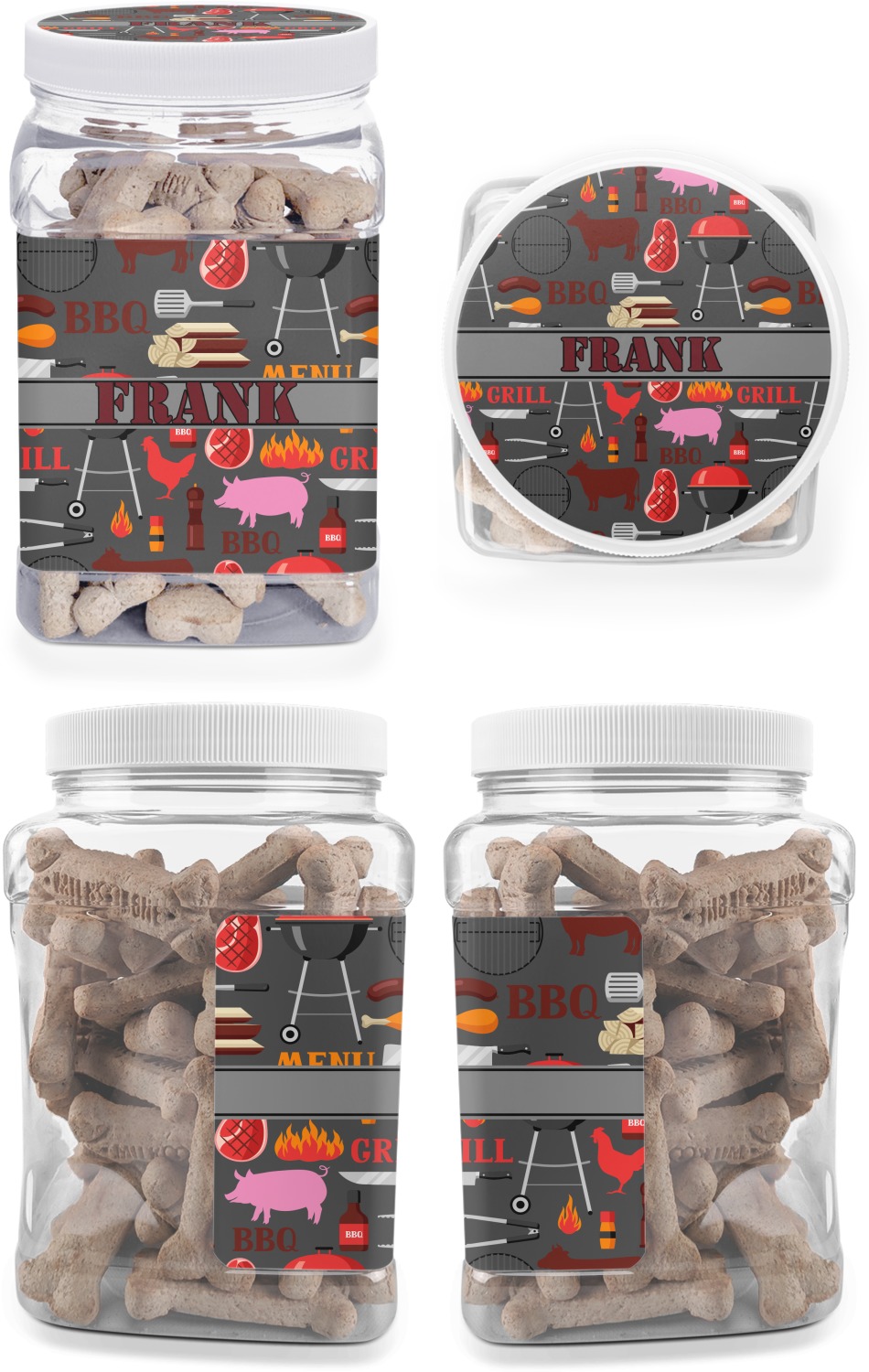 This half gallon jar, made from a sturdy plastic, is the perfect way to keep treats from any naughty pet paws, while still keeping them ready on hand for when your pup performs an impressive trick. This dog cookie jar features a screw-on, white lid that displays your personalized design on a vinyl sticker. We apply another customized sticker that wraps around the front and sides of the jar. Our dog treat jar also has indentations on the rear ends of the sides, which allows for convenient handling, and its square frame allows for easy storage.