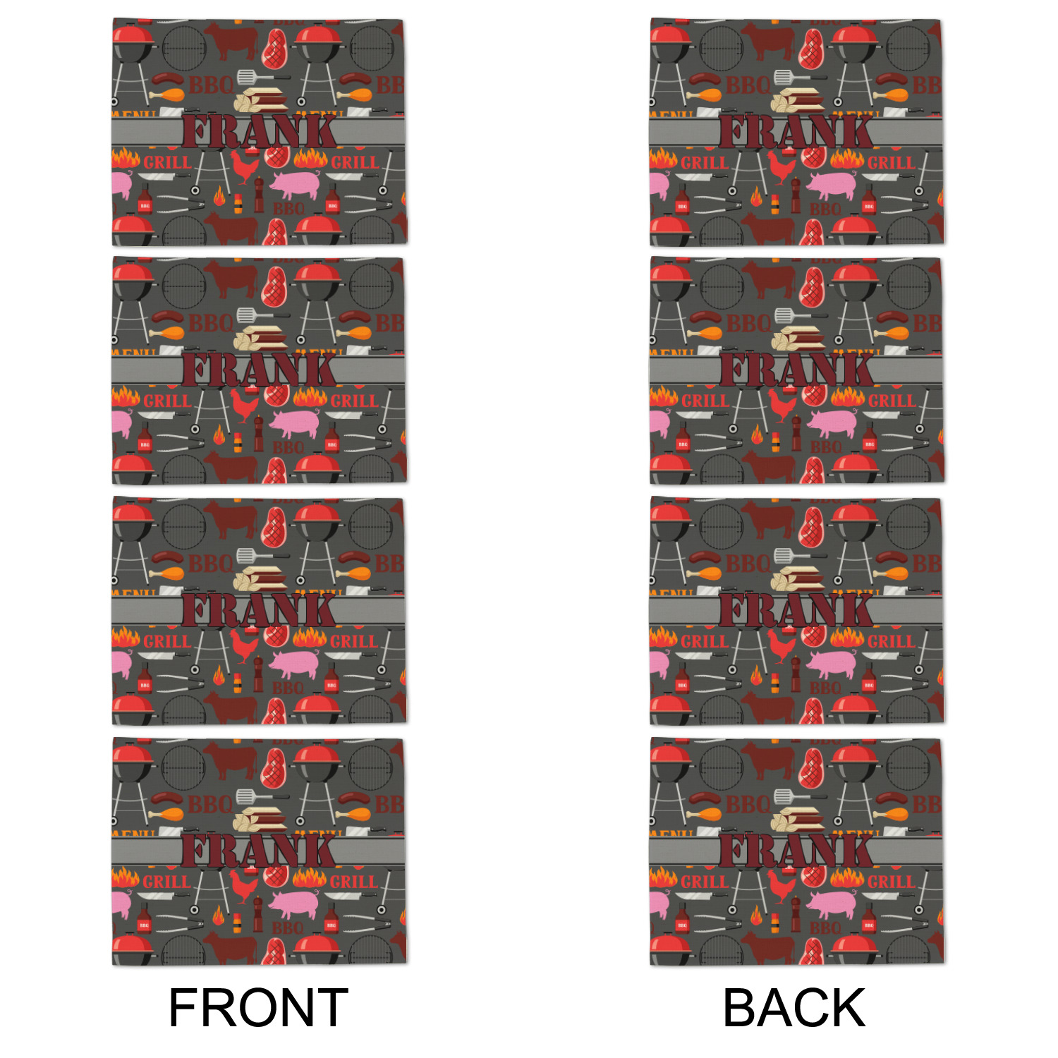 This design features pigs, cows, grills, and more on a simple grey background. There are wonderful contrasting reds, oranges, and charcoals in this manly design. The ribbon across the middle fits your personalization right in the middle.