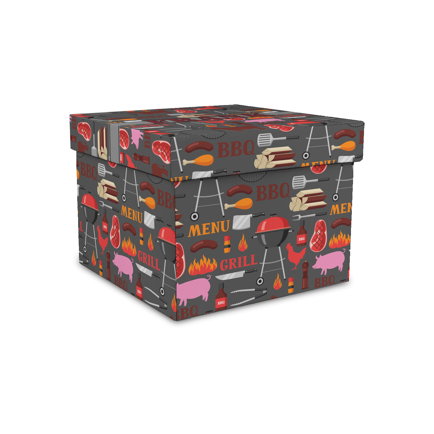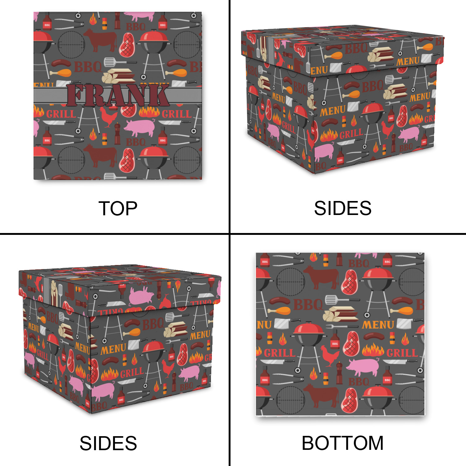 This design features pigs, cows, grills, and more on a simple grey background. There are wonderful contrasting reds, oranges, and charcoals in this manly design. The ribbon across the middle fits your personalization right in the middle.